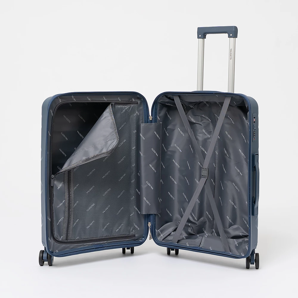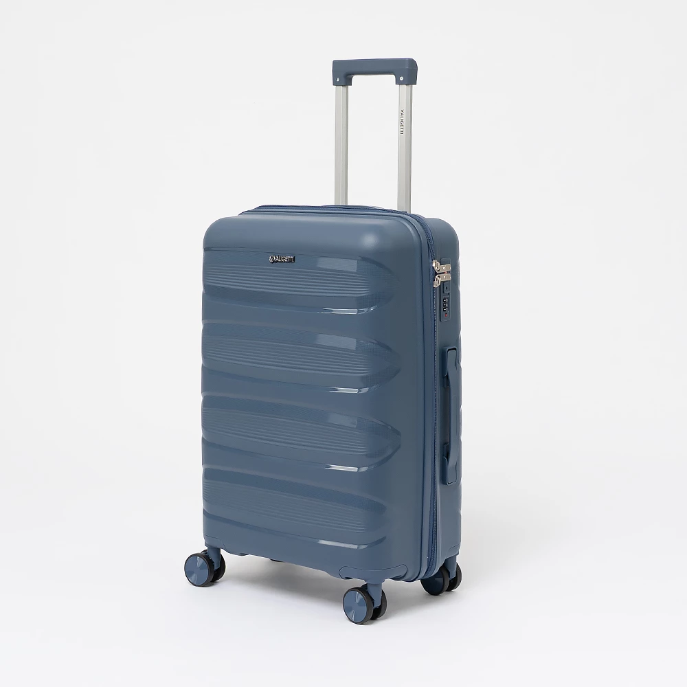 Чемодан-спиннер от бренда Valigetti из ударопрочного термостойкого полипропилена с рельефной антивандальной поверхностью синего цвета. Модель на четырех сдвоенных колесах, с выдвижной ручкой, ручками-переносками сверху и сбоку, пластиковыми ножками сбоку для защиты от износа. Закрывается молнией №8 «антивор», имеется кодовый замок, утопленный в корпус. Внутри: фирменная подкладка, в одной части — клапан-разделитель на молнии, карман-сетка на молнии, в другой части — перекрестные ремни для фиксации багажа. На верхних боковых ножках предусмотрены крючки для подвешивания пакетов.