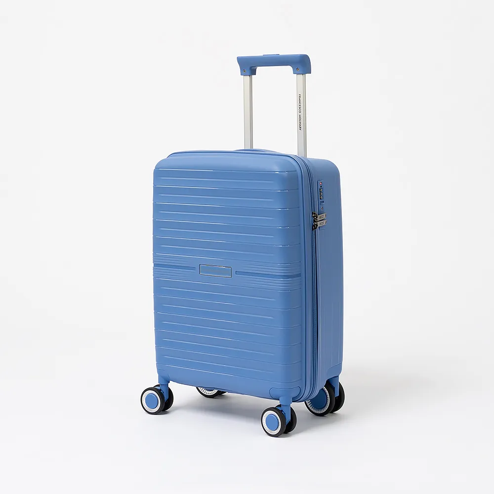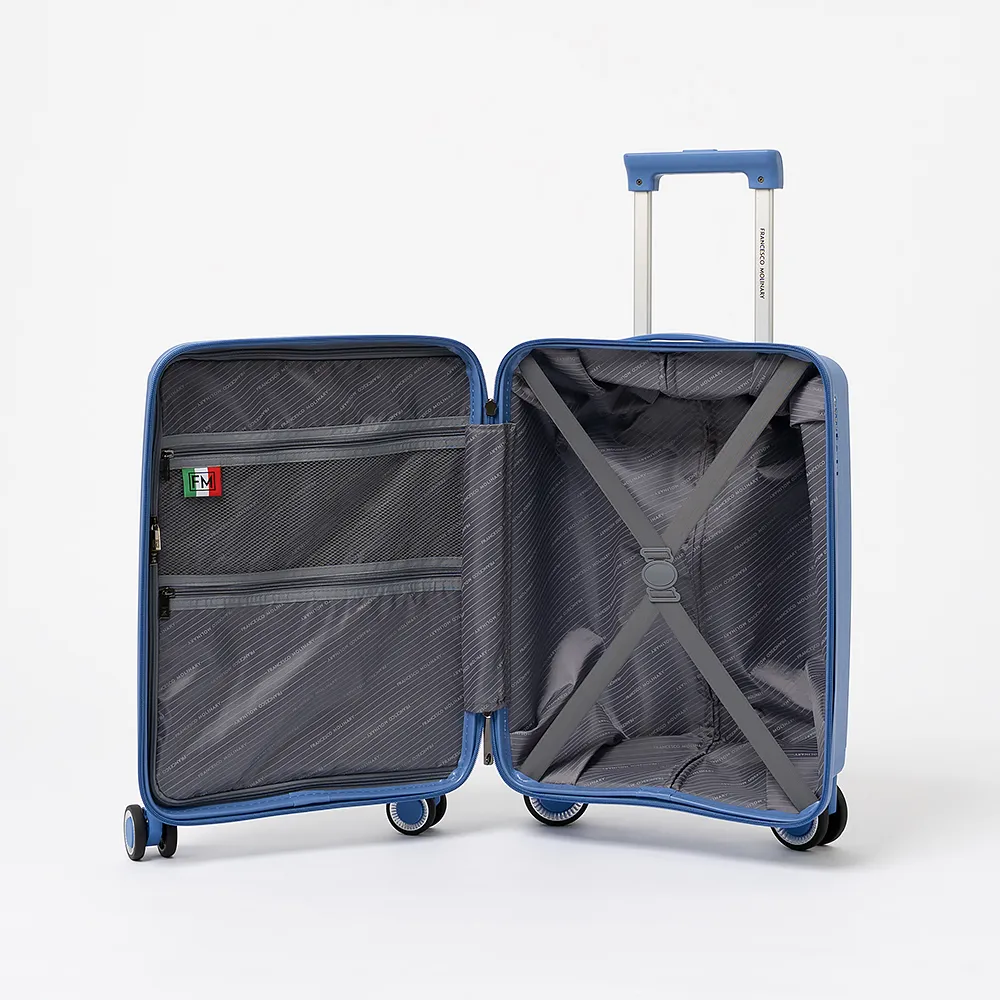 Чемодан-спиннер от торговой марки Francesco Molinary из ударопрочного термостойкого полипропилена с антивандальной узорной поверхностью синего цвета. Модель на четырех сдвоенных пластиковых колесах (задние колеса больше диаметром, чем передние для лучшей маневренности и проходимости), с выдвижной ручкой, ручкой-переноской сверху и сбоку. Закрывается молнией №8 антивор, установлен кодовый замок TSA, встроенный в корпус. Внутри: фирменная подкладка, в одной части - перекрестные ремни для фиксации багажа, в другой - клапан-разделитель на молнии, карман-сетка и карман на молнии. Сбоку имеются крючки для подвешивания сумки или пакета.