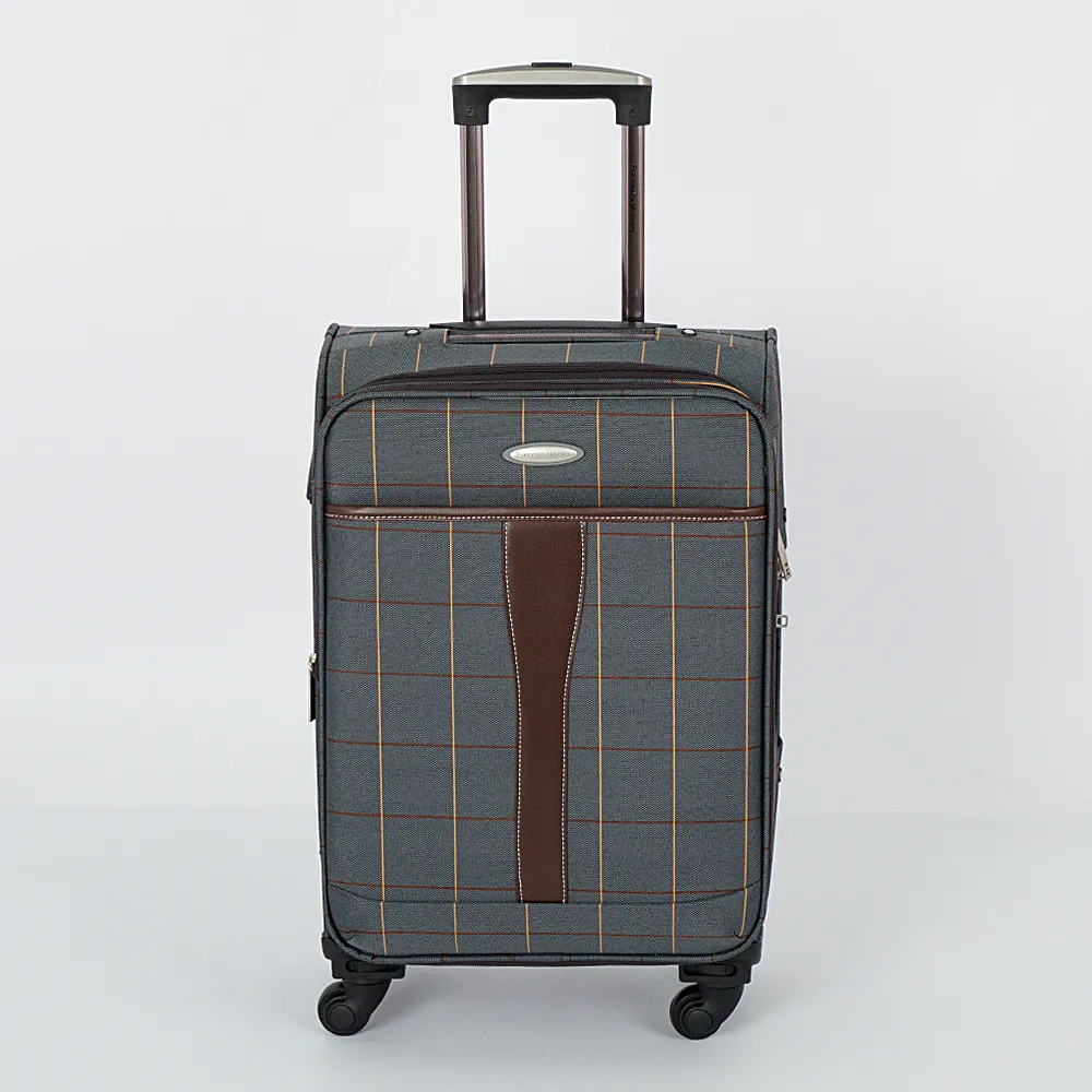 Чемодан от торговой марки Francesco Molinary выполнен из плотного текстильного материала бежевого цвета в коричнево-синюю клетку. Декорирован вставками из искусственной кожи с контрастной отстрочкой. Модель на четырех пластиковых колесах, с выдвижной металлической ручкой с кнопкой, текстильными ручками-переносками сверху и сбоку, пластиковыми ножками-опорами. Закрывается двойной антивандальной молнией, имеется кодовый замок TSA. Внутри: фирменная подкладка, на крышке - карман-сетка на молнии, в глубоком отделении - фиксирующие ремни для багажа. Имеется раздвижка на молнии для увеличения объема. На лицевой стороне - карман на молнии, на задней - адресная бирка.