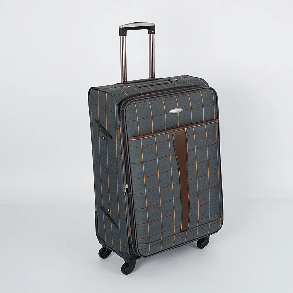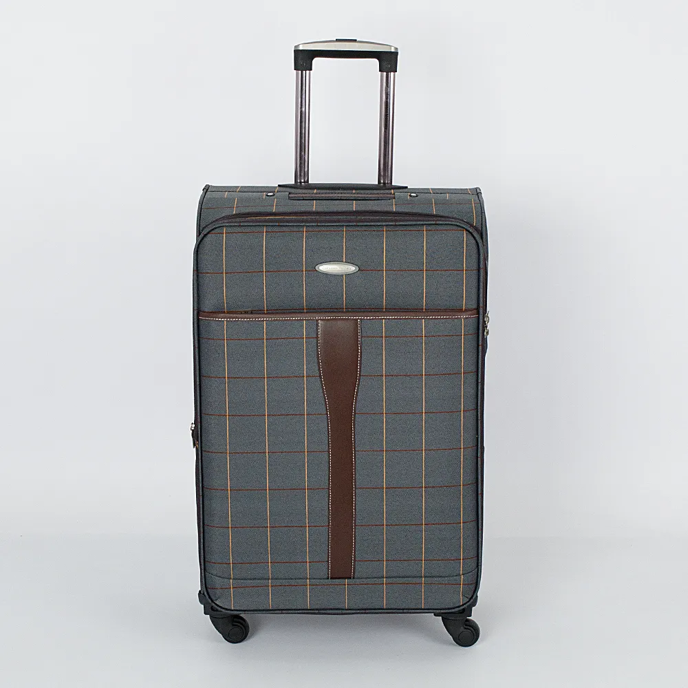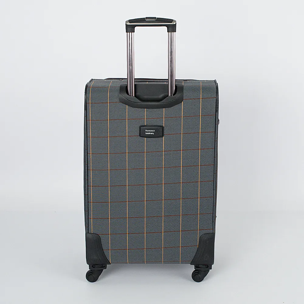 Чемодан от торговой марки Francesco Molinary выполнен из плотного текстильного материала бежевого цвета в коричнево-синюю клетку. Декорирован вставками из искусственной кожи с контрастной отстрочкой. Модель на четырех пластиковых колесах, с выдвижной металлической ручкой с кнопкой, текстильными ручками-переносками сверху и сбоку, пластиковыми ножками-опорами. Закрывается двойной антивандальной молнией, имеется кодовый замок TSA. Внутри: фирменная подкладка, на крышке - карман-сетка на молнии, в глубоком отделении - фиксирующие ремни для багажа. Имеется раздвижка на молнии для увеличения объема. На лицевой стороне - карман на молнии, на задней - адресная бирка.