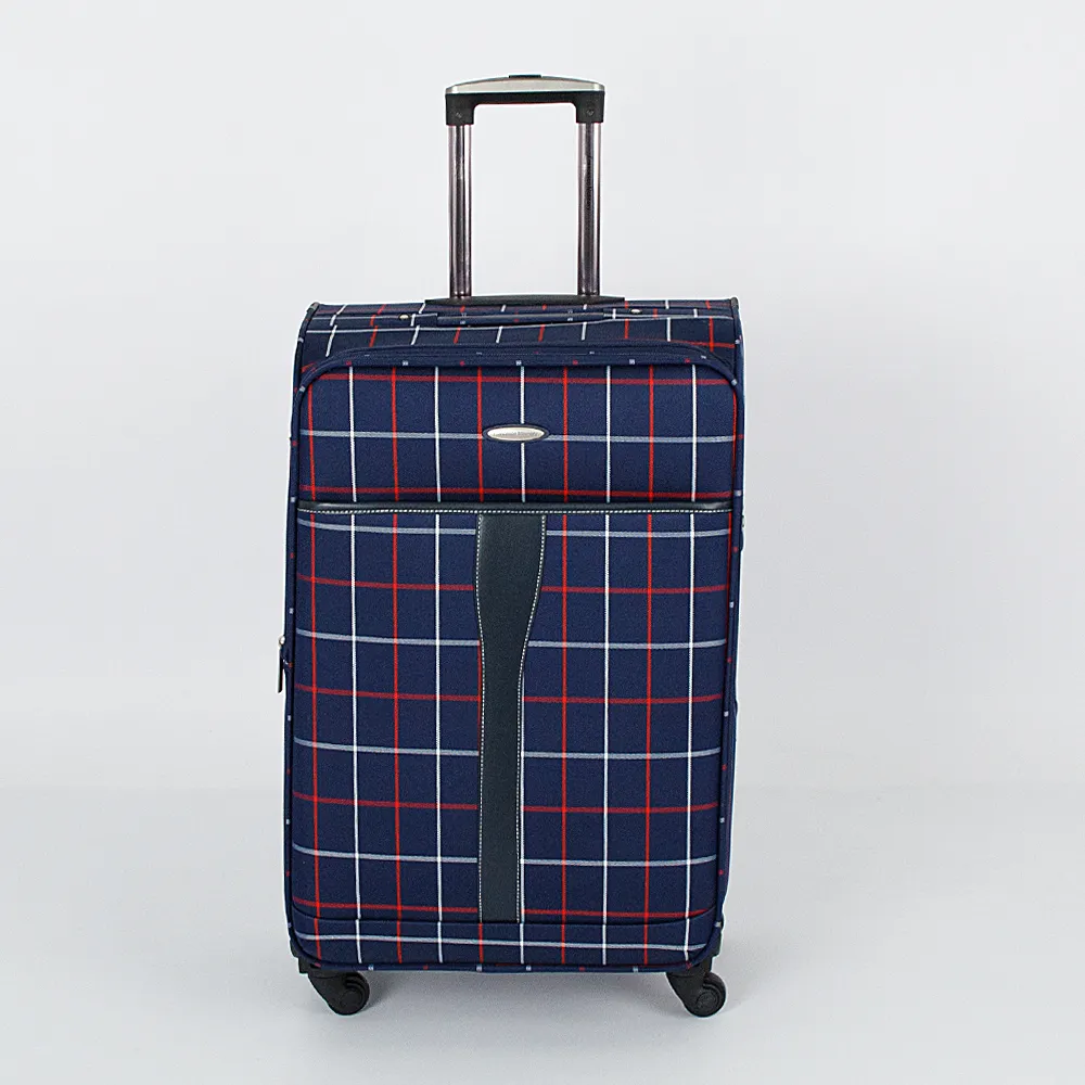 Чемодан от торговой марки Francesco Molinary выполнен из плотного текстильного материала бежевого цвета в коричнево-синюю клетку. Декорирован вставками из искусственной кожи с контрастной отстрочкой. Модель на четырех пластиковых колесах, с выдвижной металлической ручкой с кнопкой, текстильными ручками-переносками сверху и сбоку, пластиковыми ножками-опорами. Закрывается двойной антивандальной молнией, имеется кодовый замок TSA. Внутри: фирменная подкладка, на крышке - карман-сетка на молнии, в глубоком отделении - фиксирующие ремни для багажа. Имеется раздвижка на молнии для увеличения объема. На лицевой стороне - карман на молнии, на задней - адресная бирка.