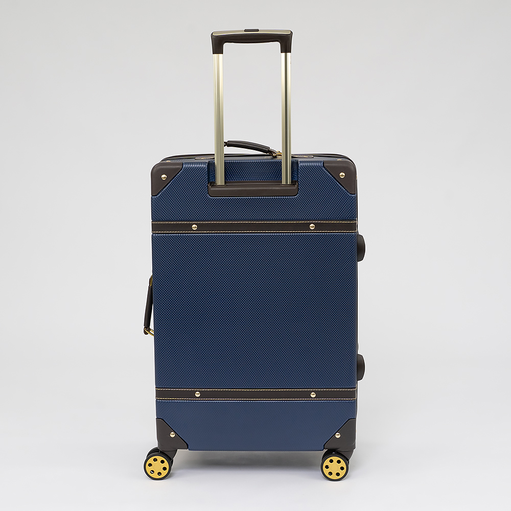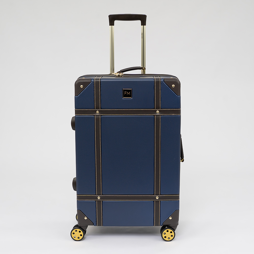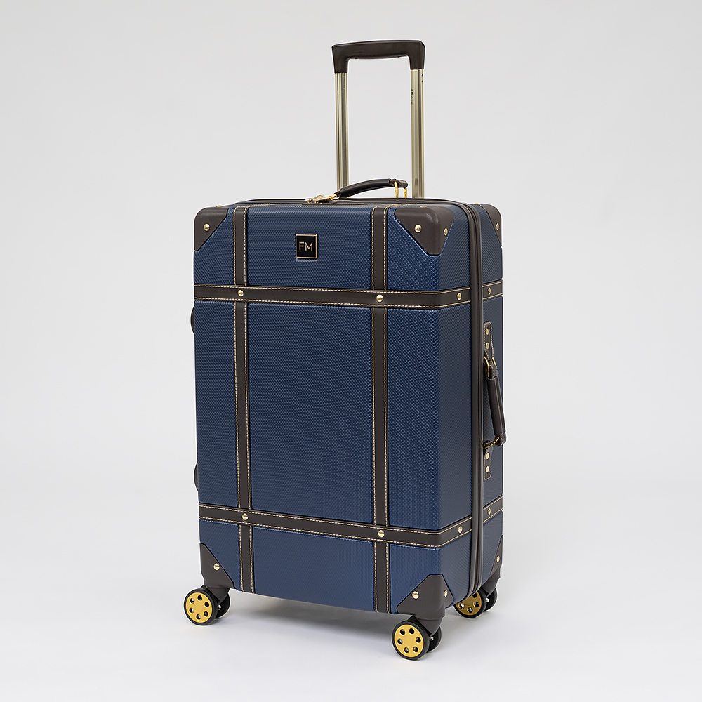 Чемодан-спиннер от торговой марки Francesco Molinary выполнен из ударопрочного ABS-пластика синего цвета. Модель на четырех сдвоенных пластиковых колесах, оснащена выдвижной металлической ручкой с кнопкой, ручками из искусственной кожи сверху и сбоку, пластиковыми ножками сбоку, утопленным в корпус кодовым замком TSA. Двойная антивандальная молния делит чемодан на две равные части, в одной из которых – клапан на молнии с внешним карманом-сеткой на молнии, в другой – перекрестные ремни для фиксации багажа. Углы чемодана укреплены пластиковыми накладками. Модель декорирована фурнитурой золотистого цвета, вставками из искусственной кожи и клепками, придающими эффект брутальности.