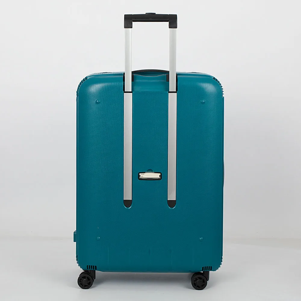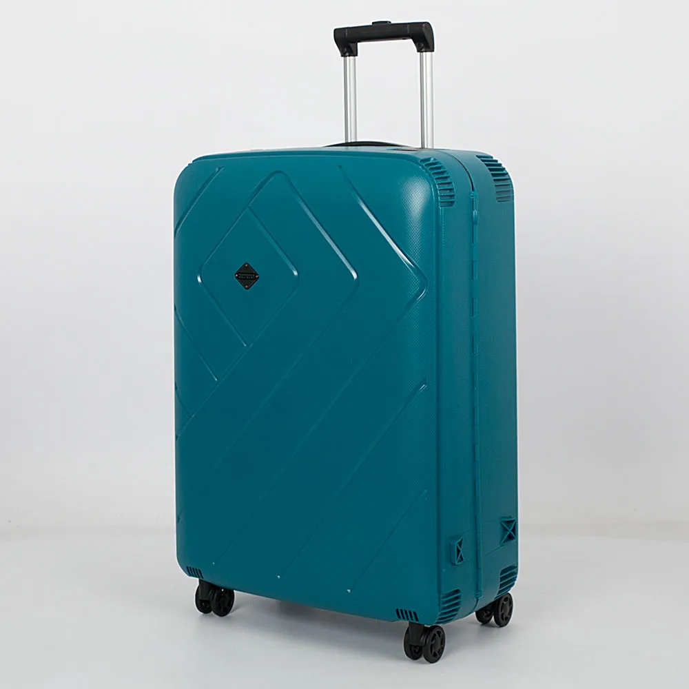 Маневренный чемодан-спиннер от торговой марки Francesco Molinary из ударопрочного полипропилена темно-синего цвета с рельефным узором. Модель на четырех сдвоенных пластиковых колесах, с выдвижной телескопической металлической ручкой с кнопкой, двумя ручками-переносками (верхняя прорезинена). Закрывается четырьмя пластиковыми защелками-клипсами. На клипсах имеются фиксаторы закрытия, верхняя клипса оснащена встроенным замком TSA. Внутри: фирменная подкладка, в обеих частях имеются эластичные фиксирующие ремни для багажа; одна из частей закрывается плотной перегородкой с карманом-сеткой на молнии. На задней стороне – адресная бирка.