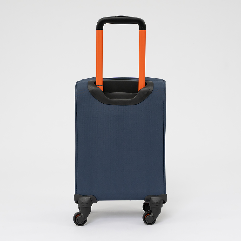 Облегченный чемодан-спиннер от торговой марки Francesco Molinary из практичного полиэстера с водоотталкивающей пропиткой синего цвета с оранжевыми деталями. Модель на четырех одинарных колесах, с выдвижной телескопической ручкой и ручкой-переноской сверху, имеется кодовый замок TSA. Отделение на молнии. Внутри: фирменная подкладка. На крышке – карман на молнии, в глубоком отделении – эластичные ремни для фиксации багажа. На лицевой стороне – карман на молнии.