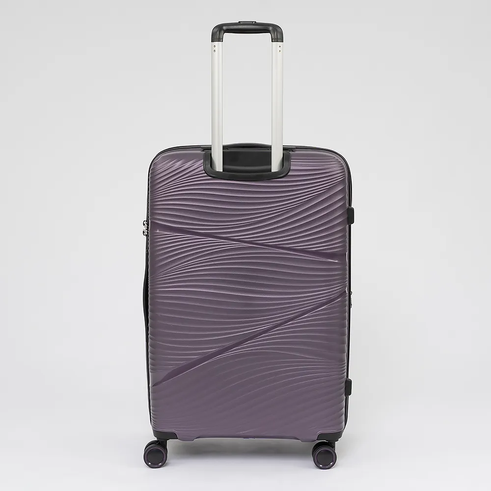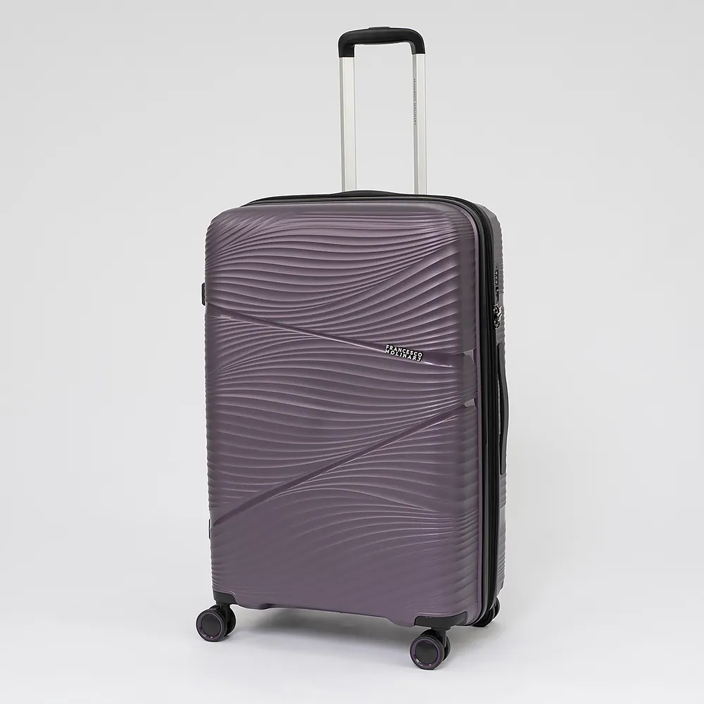 Чемодан-спиннер от торговой марки Francesco Molinary из ударопрочного полипропилена сиреневого цвета с рельефной поверхностью, имитирующей изящную драпировку. Модель на четырех сдвоенных пластиковых колесах, с выдвижной ручкой с кнопкой и алюминиевыми трубками, ручками-переносками сверху и сбоку, пластиковыми ножками-опорами сбоку. Закрывается двойной антивандальной молнией; имеется кодовый замок TSA, встроенный в корпус, и раздвижка на молнии для увеличения объема. Внутри: уплотненная фирменная подкладка; в одной части – клапан-разделитель на молнии, карман-сетка, два вместительных накладных кармана, в другой части – перекрестные ремни для фиксации багажа, посередине – навесной карман на молнии.