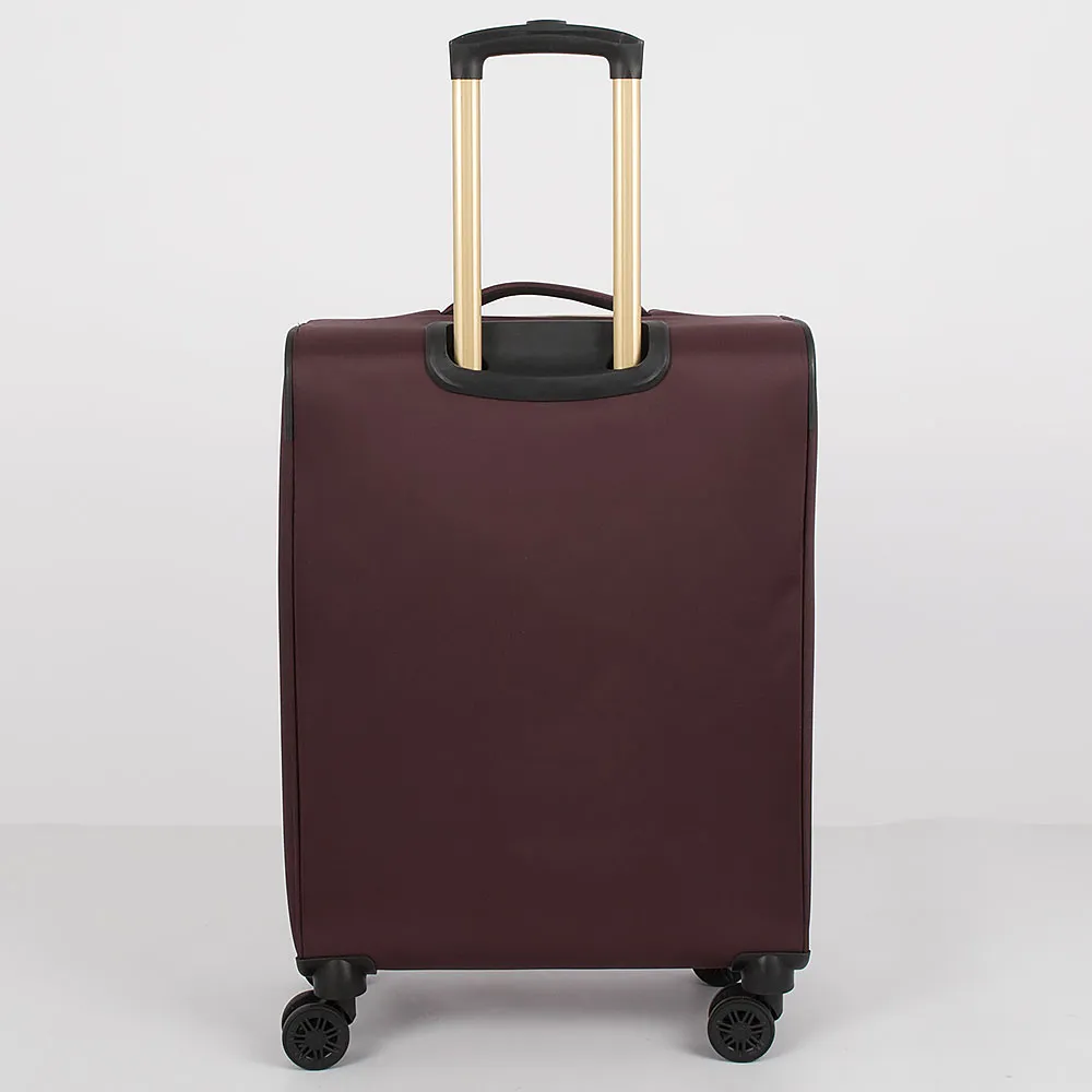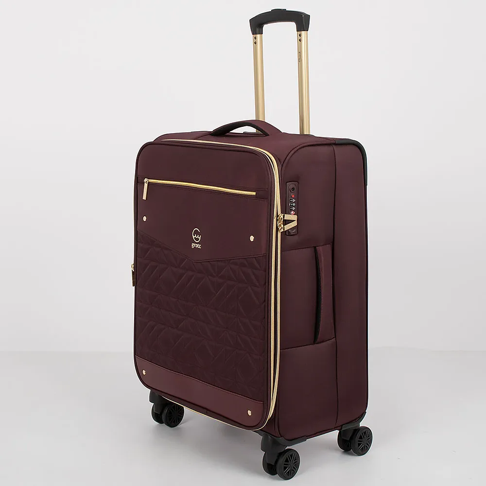 Чемодан-спиннер от торговой марки Grott из прочного текстильного материала зеленого цвета. Модель на четырех пластиковых колесах, с выдвижной ручкой с железными трубками, ручками-переносками сверху и сбоку. Закрывается молнией золотистого цвета; имеется замок TSA, утопленный в корпус. Внутри: фирменная подкладка плотностью 210 Ден; на крышке – два кармана на молнии, в том числе карман-сетка; в глубоком отделении – ремни для фиксации багажа. На лицевой стороне – карман на молнии; вставка, декорированная мягкой стежкой. Верхние углы креплены пластиковыми накладками для защиты от износа. Имеется раздвижка на молнии для увеличения объема.