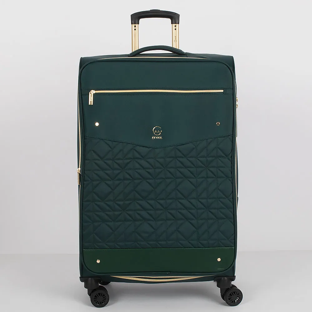 Чемодан-спиннер от торговой марки Grott из прочного текстильного материала зеленого цвета. Модель на четырех пластиковых колесах, с выдвижной ручкой с железными трубками, ручками-переносками сверху и сбоку. Закрывается молнией золотистого цвета; имеется замок TSA, утопленный в корпус. Внутри: фирменная подкладка плотностью 210 Ден; на крышке – два кармана на молнии, в том числе карман-сетка; в глубоком отделении – ремни для фиксации багажа. На лицевой стороне – карман на молнии; вставка, декорированная мягкой стежкой. Верхние углы креплены пластиковыми накладками для защиты от износа. Имеется раздвижка на молнии для увеличения объема.