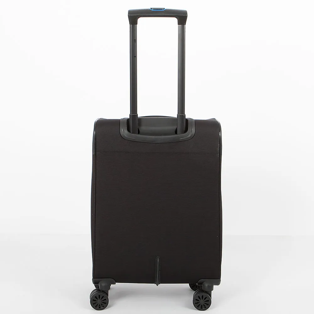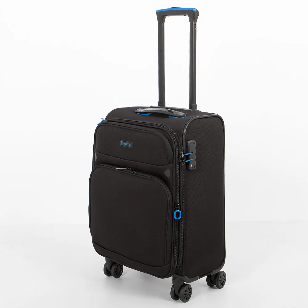 Чемодан-спиннер от торговой марки Francesco Molinary из практичного полиэстера плотностью 900 Ден с влагостойкой пропиткой в черном цвете. Модель на четырех сдвоенных колесах, с выдвижной ручкой с железными трубками, прорезиненной ручкой-переноской сверху и ручкой сбоку, держателем на дне. Закрывается двойной антивандальной молнией; имеется кодовый замок TSA и раздвижка на молнии для увеличения объема. Верхние углы укреплены прорезиненными накладками. Внутри: уплотненная фирменная подкладка; на крышке – карман-сетка на молнии, в глубоком отделении – фиксирующие ремни для багажа. На лицевой стороне – два кармана на молнии.