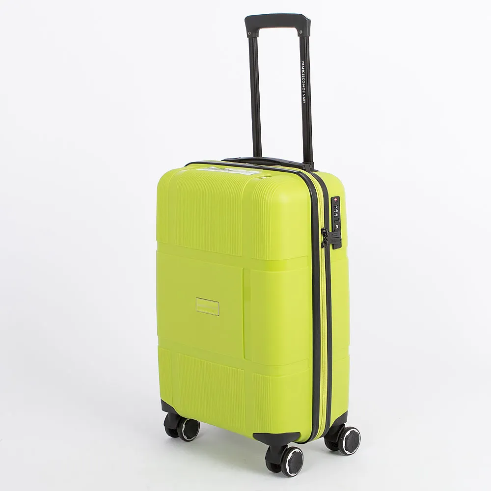Чемодан-спиннер от торговой марки Francesco Molinary из ударопрочного термостойкого полипропилена с антивандальной узорной поверхностью разной фактуры в черном цвете. Модель на четырех сдвоенных пластиковых колесах, с выдвижной ручкой с железными трубками, ручкой-переноской сверху. Закрывается двойной антивандальной молнией; имеется кодовый замок TSA, встроенный в корпус. Внутри: фирменная подкладка плотностью 210 Ден; в одной части – перекрестные ремни для фиксации багажа, в другой – клапан-разделитель на молнии. Размер подходит в качестве ручной клади для большинства авиакомпаний.