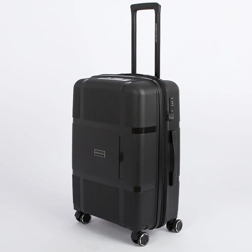 Чемодан-спиннер от торговой марки Francesco Molinary из ударопрочного термостойкого полипропилена с узорной поверхностью разной фактуры в салатовом цвете. Модель на четырех сдвоенных пластиковых колесах, с выдвижной ручкой с железными трубками, ручками-переносками сверху и снизу, пластиковыми ножками-опорами сбоку с крючком для ручной клади. Закрывается двойной антивандальной молнией; имеется кодовый замок TSA, встроенный в корпус. Внутри: фирменная подкладка плотностью 210 Ден; в одной части – перекрестные ремни для фиксации багажа, в другой – клапан-разделитель на молнии. Имеется раздвижка на молнии для увеличения объема.