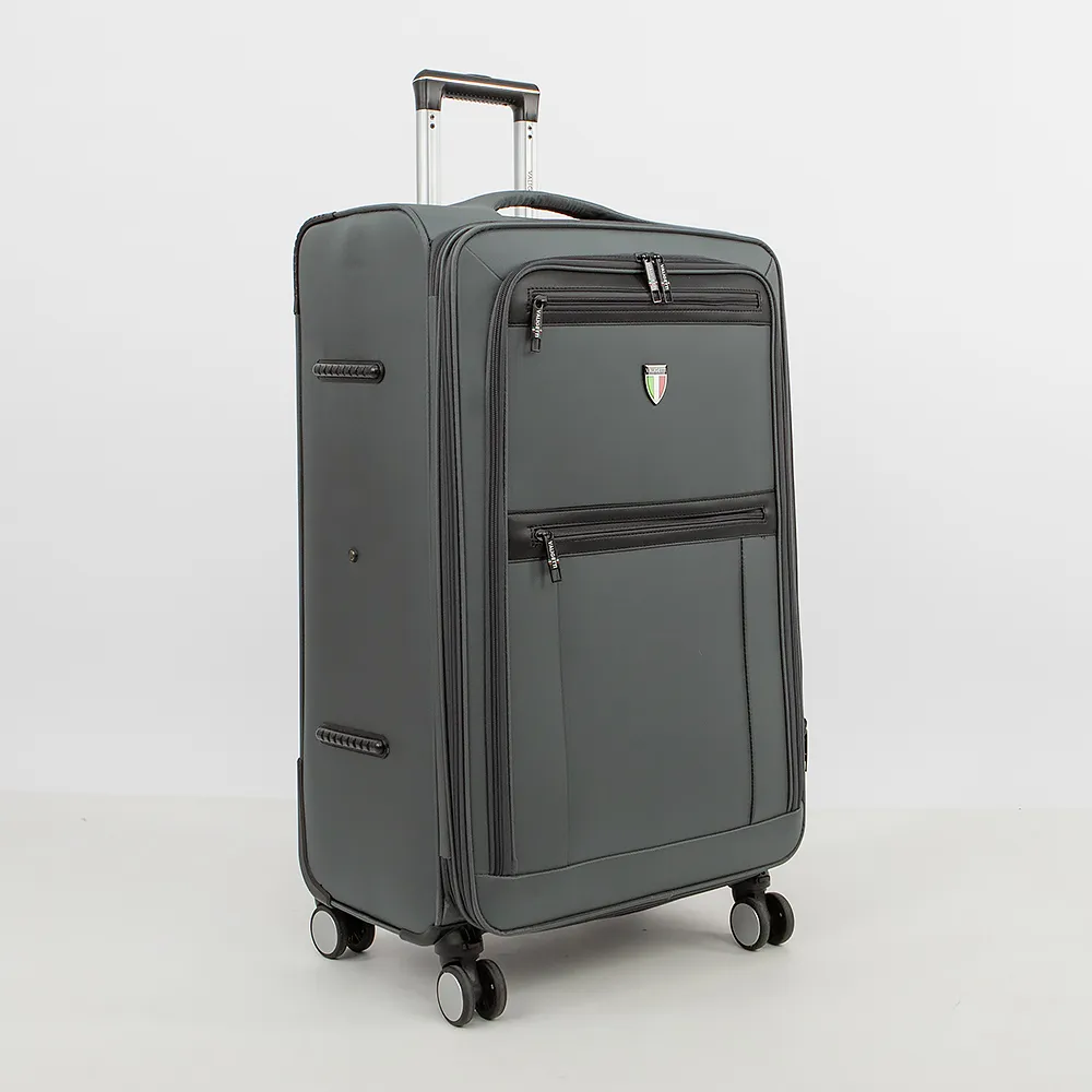 Чемодан-спиннер от торговой марки Valigetti из прочного текстильного материала синего цвета. Декорирован деталями в цвете итальянского флага. Модель на четырех сдвоенных прорезиненных съемных колесах, с выдвижной ручкой, двумя ручками, укрепленными хольнитенами, ручкой-держателем на дне, ножками-опорами сбоку. Верхние углы защищены прорезиненными накладками, нижняя часть – пластиковыми накладками. Закрывается молнией; имеется кодовый замок с выдвижным адресным окном. Внутри: фирменная подкладка с поролоновой вставкой. В глубоком отделении – фиксирующие ремни для багажа; на крышке – два кармана на молнии. На лицевой стороне – вместительный карман-отделение, два кармана на молнии. На спинке – выдвижное адресное окошко. Имеется раздвижка на молнии для увеличения объема.