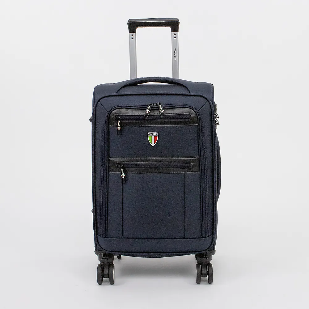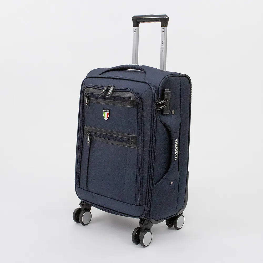 Чемодан-спиннер от торговой марки Valigetti из прочного текстильного материала синего цвета. Декорирован деталями в цвете итальянского флага. Модель на четырех сдвоенных прорезиненных съемных колесах, с выдвижной ручкой, двумя ручками, укрепленными хольнитенами, ручкой-держателем на дне, ножками-опорами сбоку. Верхние углы защищены прорезиненными накладками, нижняя часть – пластиковыми накладками. Закрывается молнией; имеется кодовый замок с выдвижным адресным окном. Внутри: фирменная подкладка с поролоновой вставкой. В глубоком отделении – фиксирующие ремни для багажа; на крышке – два кармана на молнии. На лицевой стороне – вместительный карман-отделение, два кармана на молнии. На спинке – выдвижное адресное окошко. Имеется раздвижка на молнии для увеличения объема.