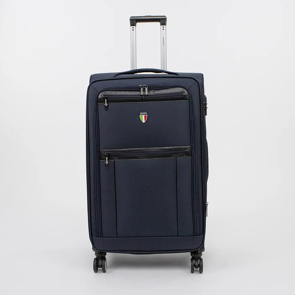 Чемодан-спиннер от торговой марки Valigetti из прочного текстильного материала синего цвета. Декорирован деталями в цвете итальянского флага. Модель на четырех сдвоенных прорезиненных съемных колесах, с выдвижной ручкой, двумя ручками, укрепленными хольнитенами, ручкой-держателем на дне, ножками-опорами сбоку. Верхние углы защищены прорезиненными накладками, нижняя часть – пластиковыми накладками. Закрывается молнией; имеется кодовый замок с выдвижным адресным окном. Внутри: фирменная подкладка с поролоновой вставкой. В глубоком отделении – фиксирующие ремни для багажа; на крышке – два кармана на молнии. На лицевой стороне – вместительный карман-отделение, два кармана на молнии. На спинке – выдвижное адресное окошко. Имеется раздвижка на молнии для увеличения объема.