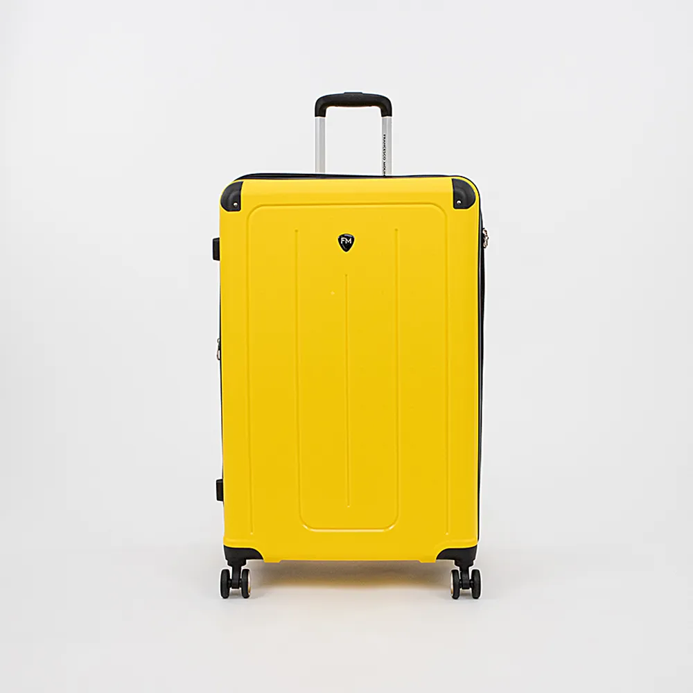 Маневренный чемодан-спиннер от торговой марки Francesco Molinary выполнен из ударопрочного полипропилена в желтом цвете. Модель на четырех сдвоенных пластиковых колесах, с выдвижной телескопической ручкой, прорезиненной ручкой-переноской сверху и сбоку; пластиковыми ножками сбоку. Отделение на молнии с двумя встречными бегунками с отверстиями для навесного замка, не входящего в комплект; имеется кодовый замок, утопленный в корпус. Закрывается на двойную антивандальную молнию «антивор». Внутри: фирменная подкладка, в одной части – клапан-разделитель и карман-сетка на молнии, в другой – перекрестные фиксирующие ремни для багажа; посередине имеется карман на молнии. В верхней части чемодан укреплен пластиковыми угловыми накладками. Имеется раздвижка на молнии для увеличения объема.
