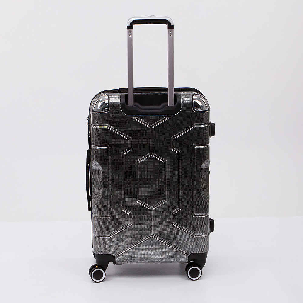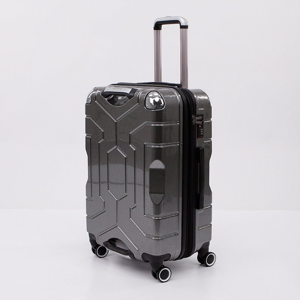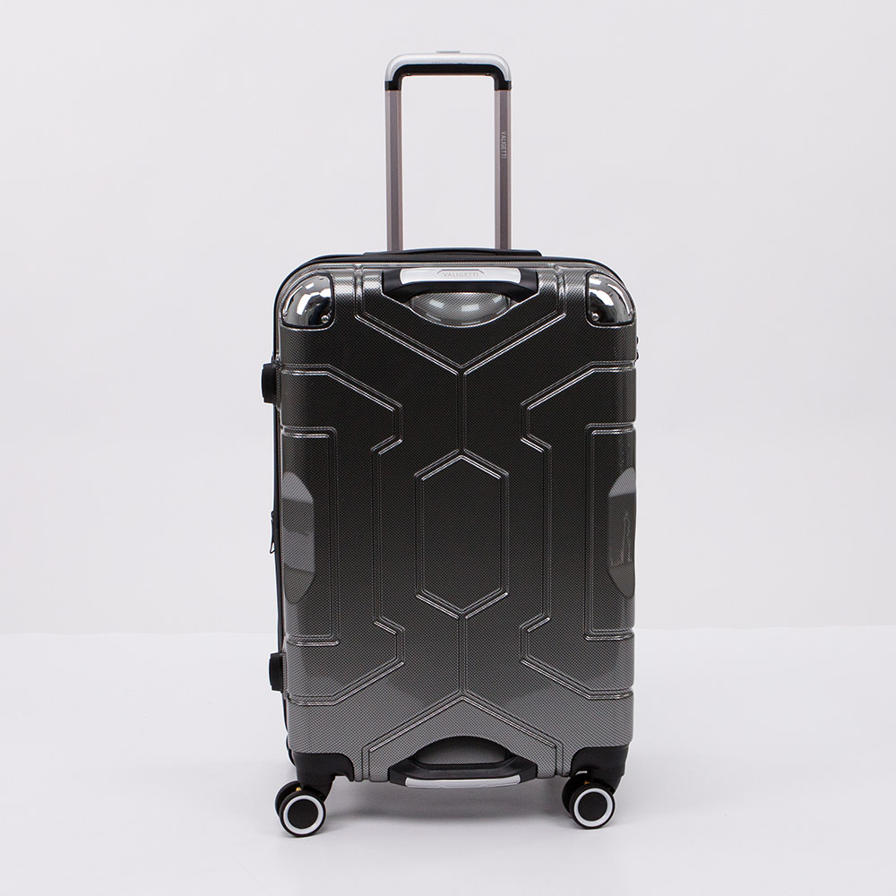 Маневренный чемодан-спиннер от торговой марки Valigetti из ударопрочного пластика ABS и поликарбоната, облегчающего конструкцию. Модель в зеленом цвете с эффектным рельефным рисунком; металлическая выдвижная ручка, четыре ручки переноски, пластиковые ножки-опоры сбоку, двойные съемные прорезиненные колеса, обеспечивающие плавный бесшумный ход. Закрывается молнией; имеется кодовый замок, утопленный в корпус. Внутри: фирменная подкладка, в одной части – перекрестные ремни для фиксации багажа, в другой – клапан-разделитель на молнии. Имеется раздвижка на молнии для увеличения объема.