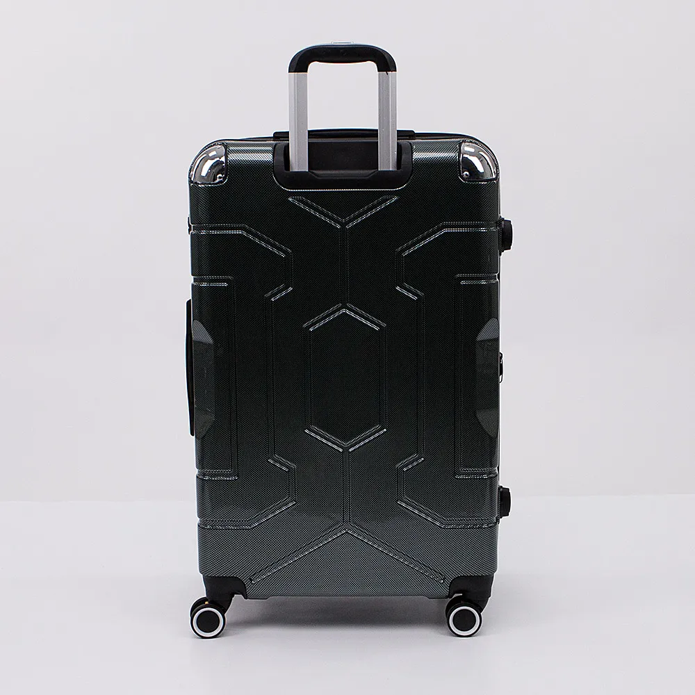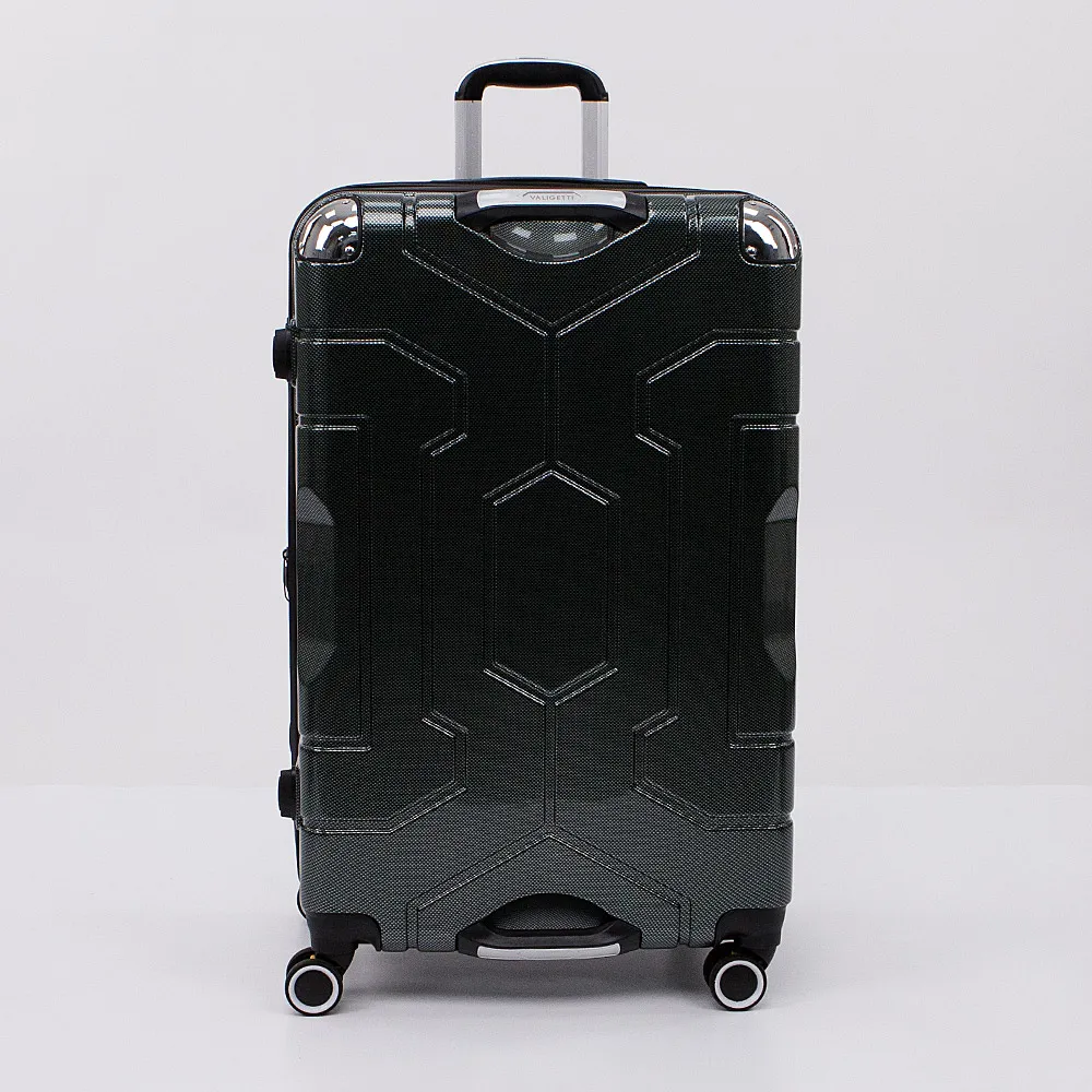 Маневренный чемодан-спиннер от торговой марки Valigetti из ударопрочного пластика ABS и поликарбоната, облегчающего конструкцию. Модель в зеленом цвете с эффектным рельефным рисунком; металлическая выдвижная ручка, четыре ручки переноски, пластиковые ножки-опоры сбоку, двойные съемные прорезиненные колеса, обеспечивающие плавный бесшумный ход. Закрывается молнией; имеется кодовый замок, утопленный в корпус. Внутри: фирменная подкладка, в одной части – перекрестные ремни для фиксации багажа, в другой – клапан-разделитель на молнии. Имеется раздвижка на молнии для увеличения объема.