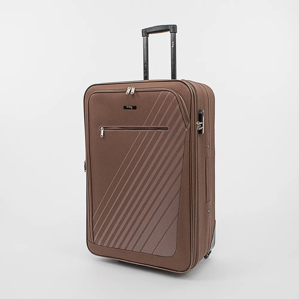 Чемодан от торговой марки Mr.Bag из практичного текстильного материала коричневого цвета. Модель апрайт на двух пластиковых колесах, с выдвижной ручкой, ручками-переносками сверху и сбоку, держателем на дне, пластиковыми ножками на дне и сбоку. Закрывается молнией с двумя встречными бегунками и отверстиями для навесного замка, не входящего в комплект; имеется накладной кодовый замок. Внутри: фирменная подкладка; в глубоком отделении – фиксирующие багажные ремни, на крышке – карман-сетка на молнии. На лицевой стороне – два кармана на молнии. На задней стороне – адресное окошко.