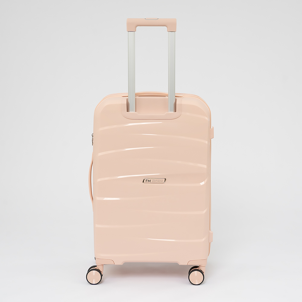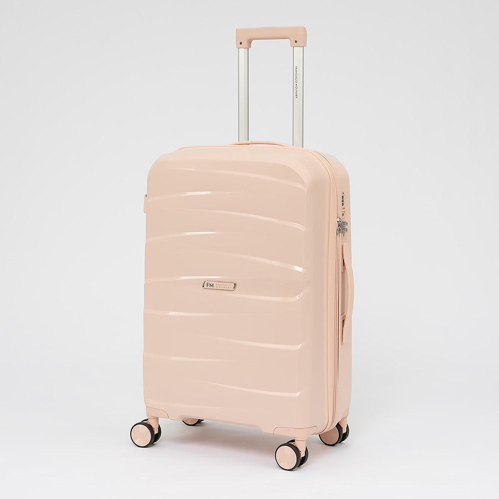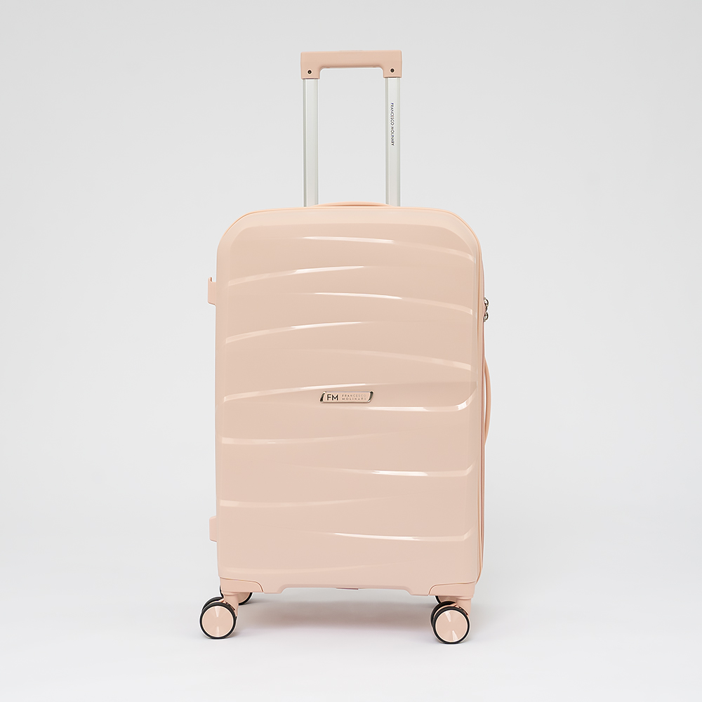 Чемодан-спиннер от торговой марки Francesco Molinary из ударопрочного термостойкого полипропилена с рельефной поверхностью в светло-розовом цвете. Модель на четырех сдвоенных пластиковых колесах с прорезиненной поверхностью, что обеспечивает плавный бесшумный ход, с выдвижной телескопической ручкой, ручками-переносками сверху и сбоку, пластиковыми ножками-опорами сбоку, верхние ножки выполнены в виде крючков для подвешивания. Закрывается двойной антивандальной молнией антивор, кодовый замок TSA утоплен в корпус. Внутри: фирменная подкладка, в одной части - клапан-разделитель на молнии, карман-сетка на молнии, непромокаемый карман на молнии, в другой - перекрестные ремни для фиксации багажа. С обеих сторон имеется фирменный логотип с названием бренда.