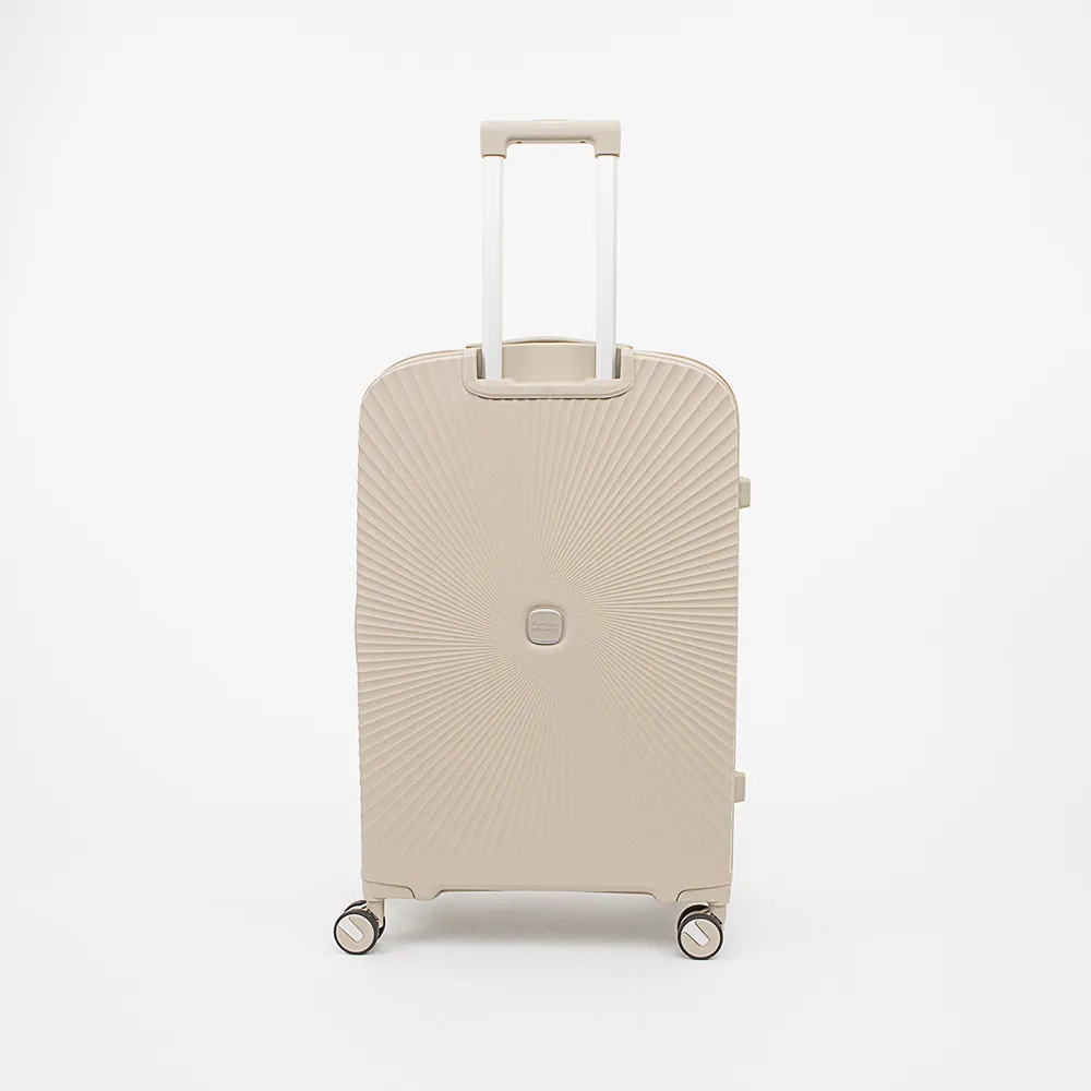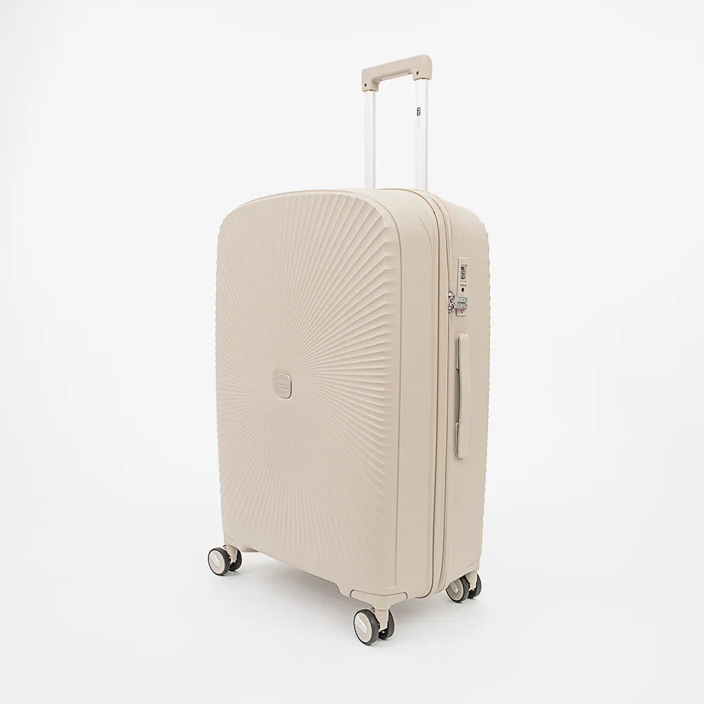 Чемодан-спиннер от торговой марки Francesco Molinary из ударопрочного термостойкого полипропилена бежевого цвета с оригинальной рельефной поверхностью. Модель с закругленными углами, на четырех сдвоенных колесах, с выдвижной алюминиевой ручкой, ручками-переносками сверху и сбоку, пластиковыми ножками-опорами сбоку. Закрывается двойной антивандальной молнией «антивор»; имеется кодовый замок TSA, утопленный в корпус. Внутри: плотная фирменная подкладка; в одной части – перекрестные ремни для фиксации багажа, в другой – клапан-разделитель на молнии, карман-сетка на молнии, водонепроницаемый карман на молнии.