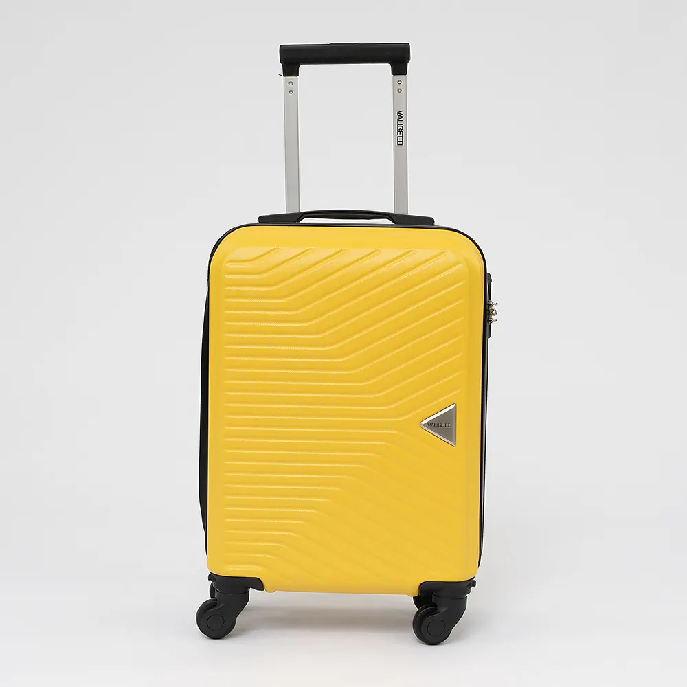 Чемодан-спиннер от торговой марки Valigetti из ударопрочного ABS-пластика с рельефной поверхностью желтого цвета. Модель на четырех съемных пластиковых колесах, с выдвижной ручкой, ручками-переносками сверху и сбоку, ножками-опорами сбоку. Имеется кодовый замок. Отделение на молнии с двумя встречными бегунками с ушками для навесного замка, не входящего в комплект. Внутри: фирменная подкладка. В одном отделении - разделитель на молнии и карман-сетка на молнии, в другом - перекрестные ремни для фиксации багажа.