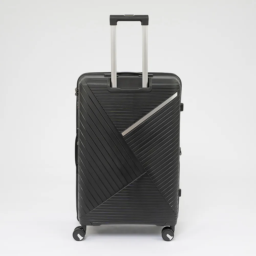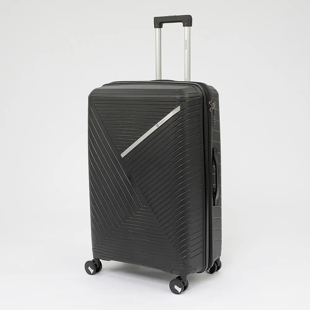 Чемодан-спиннер от торговой марки Valigetti из ударопрочного термостойкого полипропилена с рельефной антивандальной поверхностью в черном цвете. Модель на четырех сдвоенных колесах с прорезиненной накладкой, обеспечивающей бесшумный плавный ход, с выдвижной ручкой с кнопкой и железными трубками, ручками-переносками сверху и сбоку, пластиковыми ножками-опорами сбоку. Закрывается молнией, имеется кодовый замок и раздвижка на молнии для увеличения объема. Внутри: фирменная подкладка плотностью 210 Ден, в одной части – клапан-разделитель на молнии, карман-сетка на молнии, в другой части – перекрестные ремни для фиксации багажа.