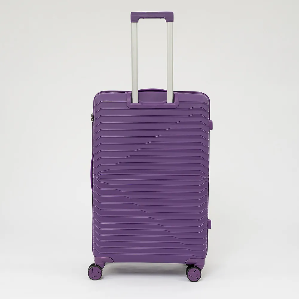 Чемодан-спиннер от торговой марки Valigetti выполнен из ударопрочного термостойкого полипропилена с антивандальной рельефной поверхностью фиолетового цвета. Модель на четырех сдвоенных пластиковых колесах, с выдвижной металлической ручкой, ручками-переносками сверху и сбоку и пластиковыми ножками сбоку. Закрывается молнией с двумя встречными бегунками, имеется кодовый замок, утопленный в корпус. Внутри: фирменная подкладка, в одной части – перекрестные ремни для фиксации багажа, в другой – клапан-разделитель на молнии, карман-сетка на молнии.