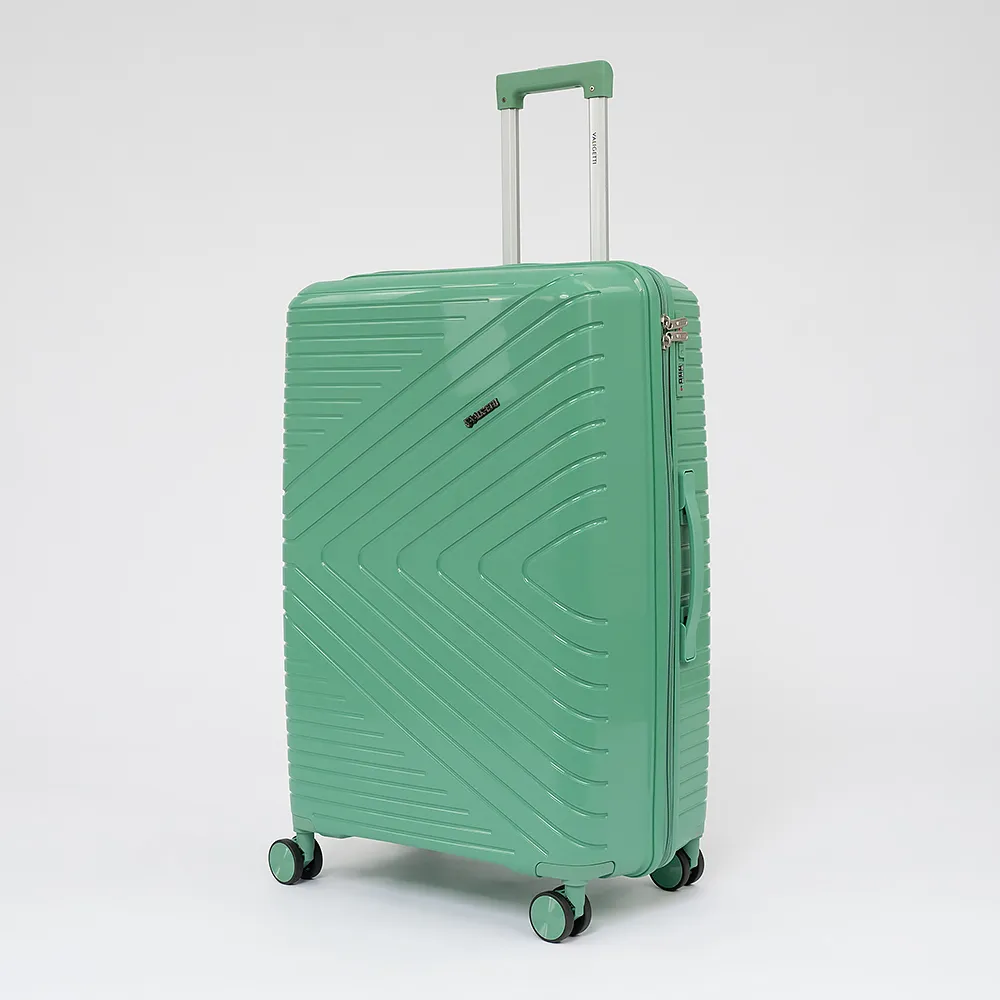 Чемодан-спиннер от торговой марки Valigetti из ударопрочного полипропилена с рельефной антивандальной поверхностью в зеленом цвете. Модель на четырех сдвоенных колесах, с выдвижной ручкой с кнопкой и железными трубками, ручкой-переноской сверху и сбоку, ножками для защиты от износа. Закрывается молнией №8 антивор, имеется кодовый замок, утопленный в корпус. Внутри: фирменная подкладка, в одной части - клапан-разделитель на молнии, карман-сетка на молнии, в другой части - перекрестные ремни для фиксации багажа. Верхние ножки выполнены в виде крючков для подвешивания.