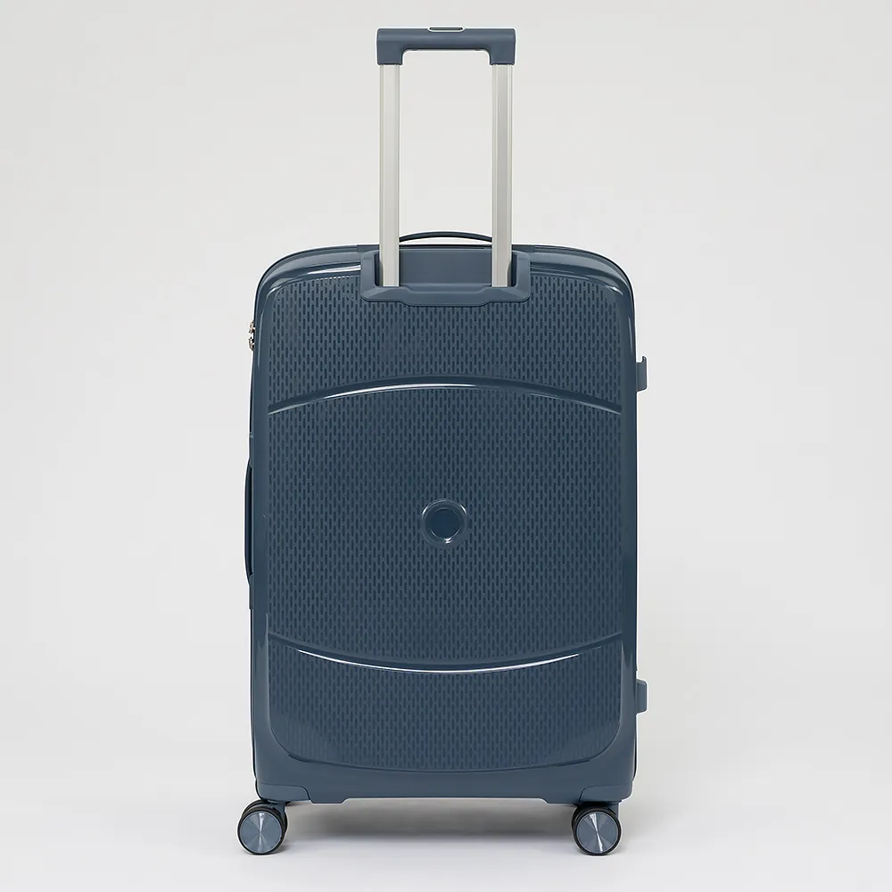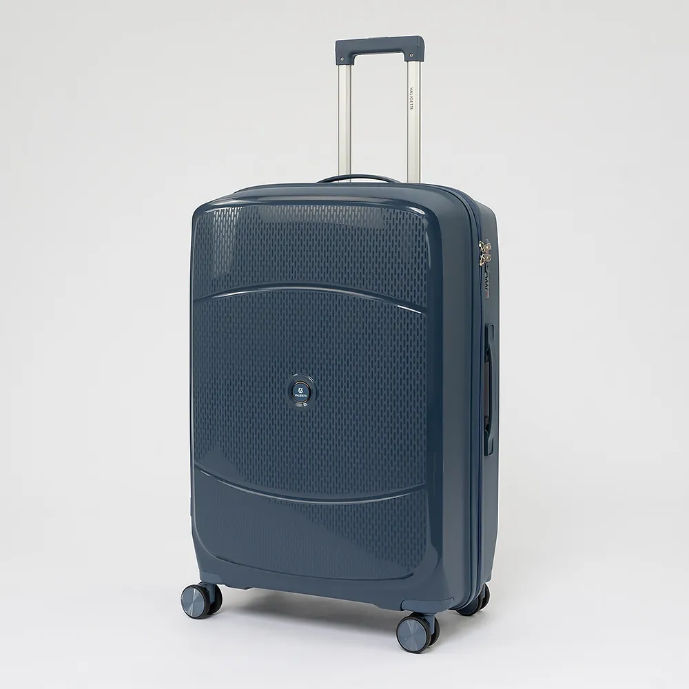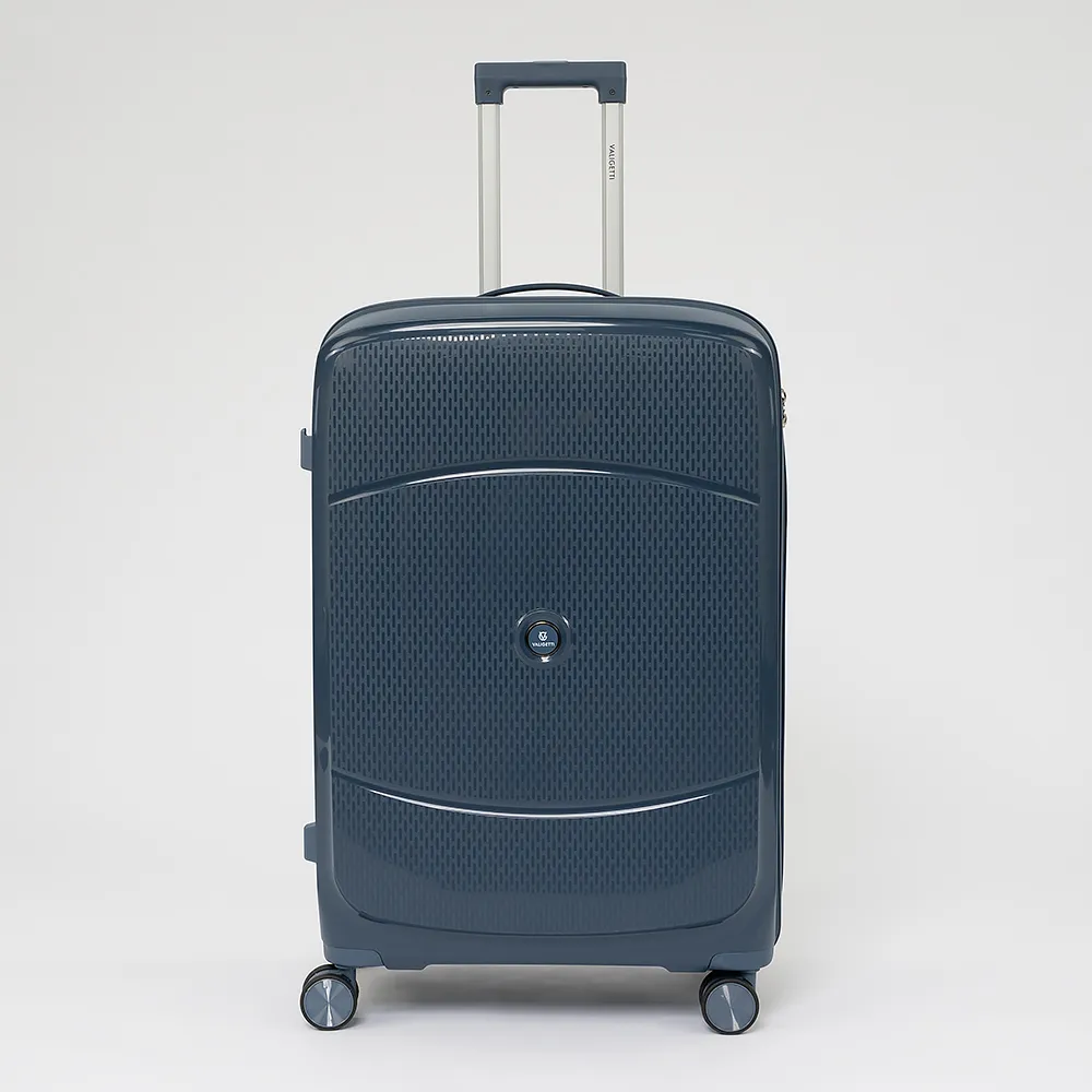 Чемодан-спиннер от торговой марки Valigetti выполнен из ударопрочного полипропилена с антивандальной рельефной поверхностью серо-зеленого цвета. Модель на четырех сдвоенных пластиковых колесах, с выдвижной металлической ручкой, ручкой-переноской сверху и сбоку, пластиковыми ножками для защиты от износа. Закрывается молнией №8 антивор с двумя встречными бегунками, имеется кодовый замок утопленный в корпус. Внутри: фирменная подкладка, в одной части - перекрестные ремни для фиксации багажа, в другой - клапан-разделитель на молнии, карман-сетка на молнии. Сбоку имеются крючки для подвешивания сумки или пакета.