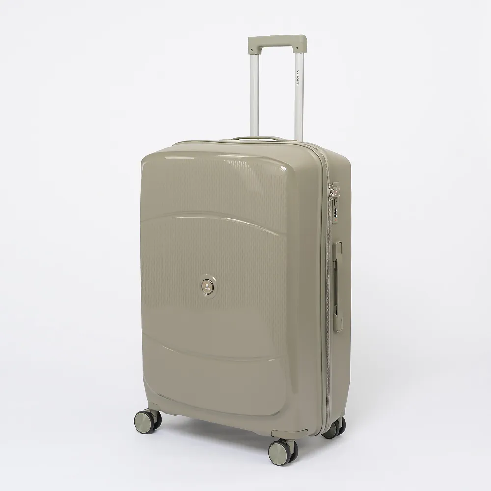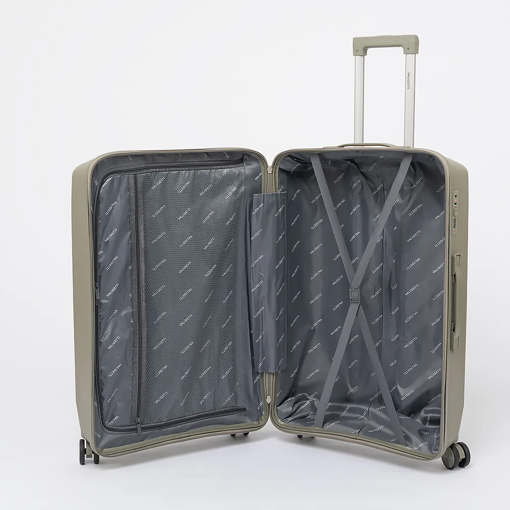 Чемодан-спиннер от торговой марки Valigetti выполнен из ударопрочного полипропилена с антивандальной рельефной поверхностью серо-зеленого цвета. Модель на четырех сдвоенных пластиковых колесах, с выдвижной металлической ручкой, ручкой-переноской сверху и сбоку, пластиковыми ножками для защиты от износа. Закрывается молнией №8 антивор с двумя встречными бегунками, имеется кодовый замок утопленный в корпус. Внутри: фирменная подкладка, в одной части - перекрестные ремни для фиксации багажа, в другой - клапан-разделитель на молнии, карман-сетка на молнии. Сбоку имеются крючки для подвешивания сумки или пакета.