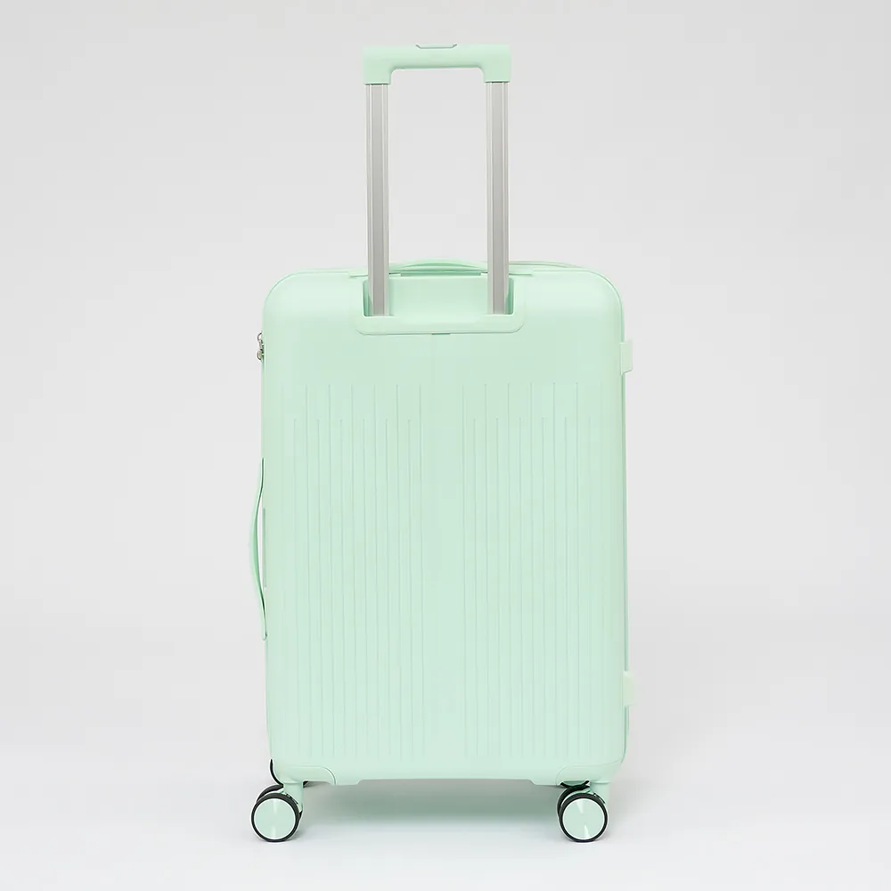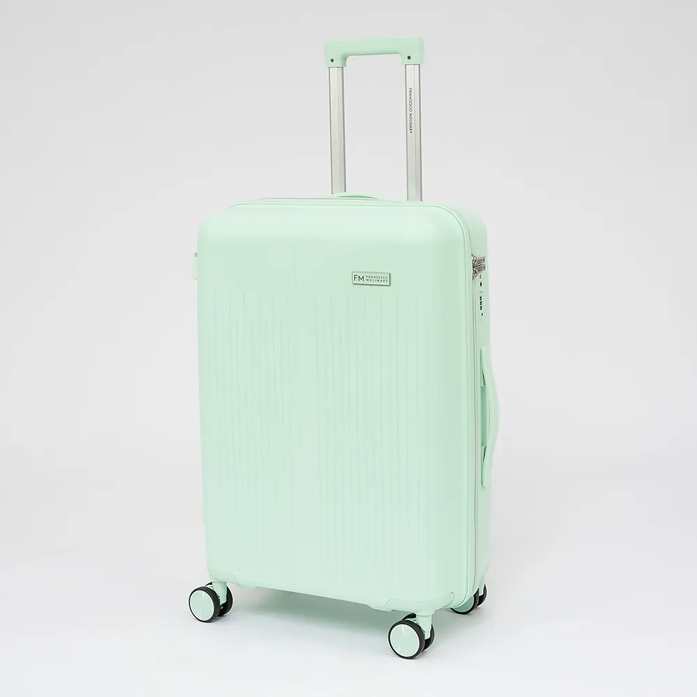 Маневренный чемодан-спиннер от торговой марки Francesco Molinary выполнен из ударопрочного полипропилена светло-зеленого цвета. Модель на четырех сдвоенных пластиковых колесах, с выдвижной телескопической ручкой с кнопкой, прорезиненной ручкой-переноской сверху и сбоку, пластиковыми ножками сбоку. Отделение на молнии с двумя встречными бегунками, имеется кодовый замок, утопленный в корпус. Закрывается на двойную антивандальную молнию антивор. Внутри: фирменная подкладка, в одной части - клапан-разделитель и два кармана на молнии, в другой - перекрестные фиксирующие ремни для багажа, посередине имеется карман на молнии. Верхние ножки выполнены в виде крючков для подвешивания.
