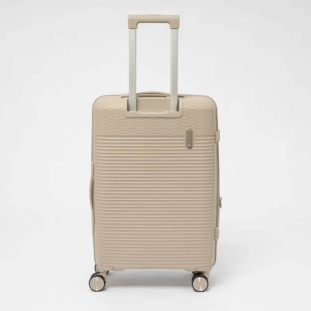 Чемодан-спиннер от торговой марки Francesco Molinary из ударопрочного термостойкого полипропилена с рельефной поверхностью черного цвета. Модель на четырех сдвоенных пластиковых колесах, с выдвижной телескопической ручкой, прорезиненной ручкой для переноски сверху и сбоку. Закрывается двойной антивандальной молнией антивор, имеется утопленный кодовый замок TSA. Внутри: фирменная подкладка, водонепроницаемый карман и карман-сетка на молнии и дополнительный карман на молнии на боковой стенке чемодана, а так же ремни для фиксации багажа. Имеется молния для увеличения объема. Сбоку имеются крючки для подвешивания сумки или пакета.