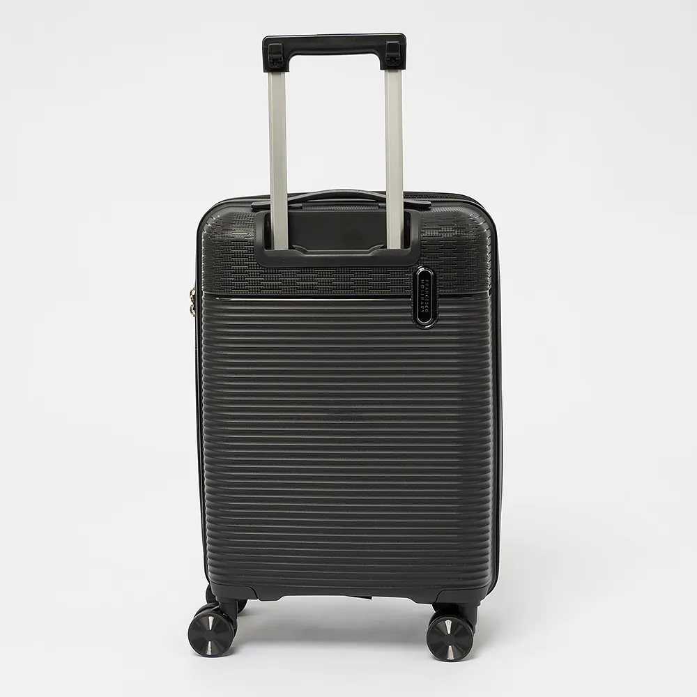 Чемодан-спиннер от торговой марки Francesco Molinary из ударопрочного термостойкого полипропилена с рельефной поверхностью черного цвета. Модель на четырех сдвоенных пластиковых колесах, с выдвижной телескопической ручкой, прорезиненной ручкой для переноски сверху и сбоку. Закрывается двойной антивандальной молнией антивор, имеется утопленный кодовый замок TSA. Внутри: фирменная подкладка, водонепроницаемый карман и карман-сетка на молнии и дополнительный карман на молнии на боковой стенке чемодана, а так же ремни для фиксации багажа. Имеется молния для увеличения объема. Сбоку имеются крючки для подвешивания сумки или пакета.