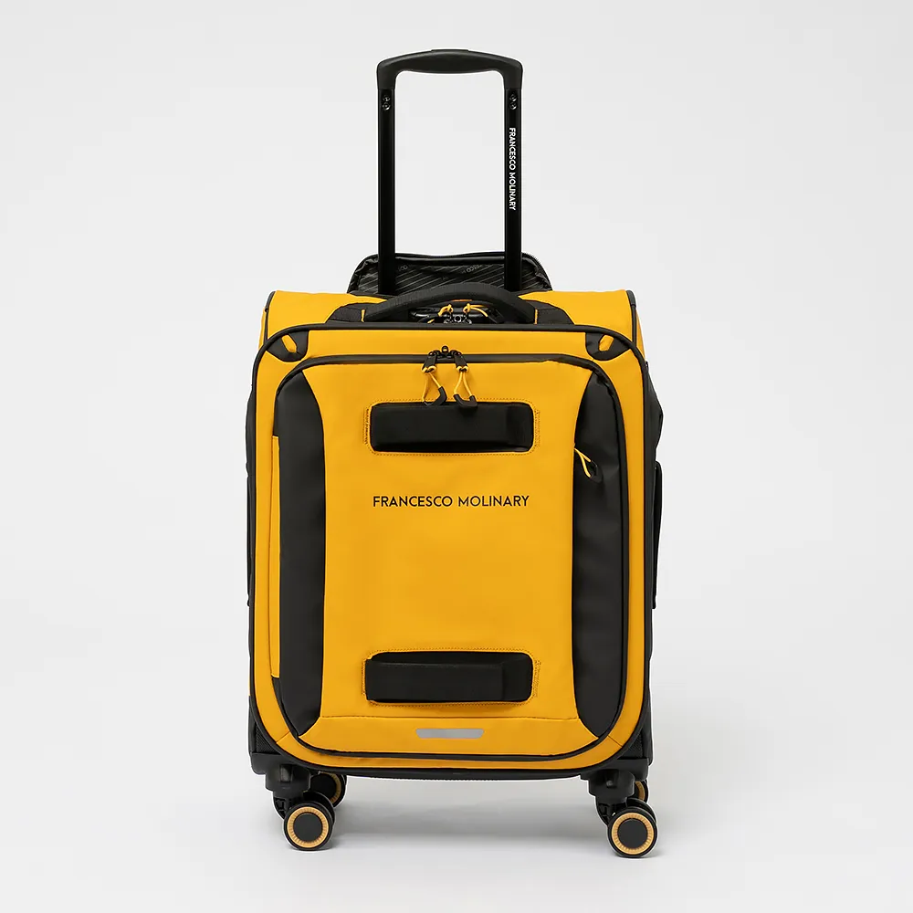 Чемодан-спиннер от торговой марки Francesco Molinary из прочного водоотталкивающего полиэстера цвета хаки. Модель на четырех сдвоенных пластиковых колесах, с выдвижной ручкой с кнопкой ( в сложенном виде закрывается клапаном на молнии) и металлическими трубками, плотными набивными ручками сверху и сбоку. Низ чемодана изготовлен из плотного прорезиненного материала, а углы и задняя стенка защищены накладками для дополнительной прочности. Имеется 2 глубоких боковых кармана, большой откидной карман на лицевой стороне и скрытый карман на молнии. Закрывается двойной антивандальной непромокаемой молнией №8 со встречными бегунками, имеется кодовый замок. Внутри: фирменная подкладка, в глубоком отделении - ремни для фиксации багажа, на крышке - карман-сетка на молнии. Имеется молния для увеличения объема.