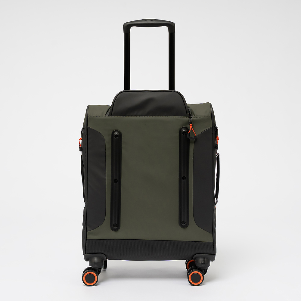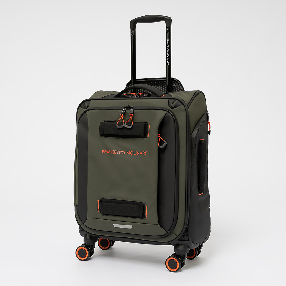 Чемодан-спиннер от торговой марки Francesco Molinary из прочного водоотталкивающего полиэстера цвета хаки. Модель на четырех сдвоенных пластиковых колесах, с выдвижной ручкой с кнопкой ( в сложенном виде закрывается клапаном на молнии) и металлическими трубками, плотными набивными ручками сверху и сбоку. Низ чемодана изготовлен из плотного прорезиненного материала, а углы и задняя стенка защищены накладками для дополнительной прочности. Имеется 2 глубоких боковых кармана, большой откидной карман на лицевой стороне и скрытый карман на молнии. Закрывается двойной антивандальной непромокаемой молнией №8 со встречными бегунками, имеется кодовый замок. Внутри: фирменная подкладка, в глубоком отделении - ремни для фиксации багажа, на крышке - карман-сетка на молнии. Имеется молния для увеличения объема.
