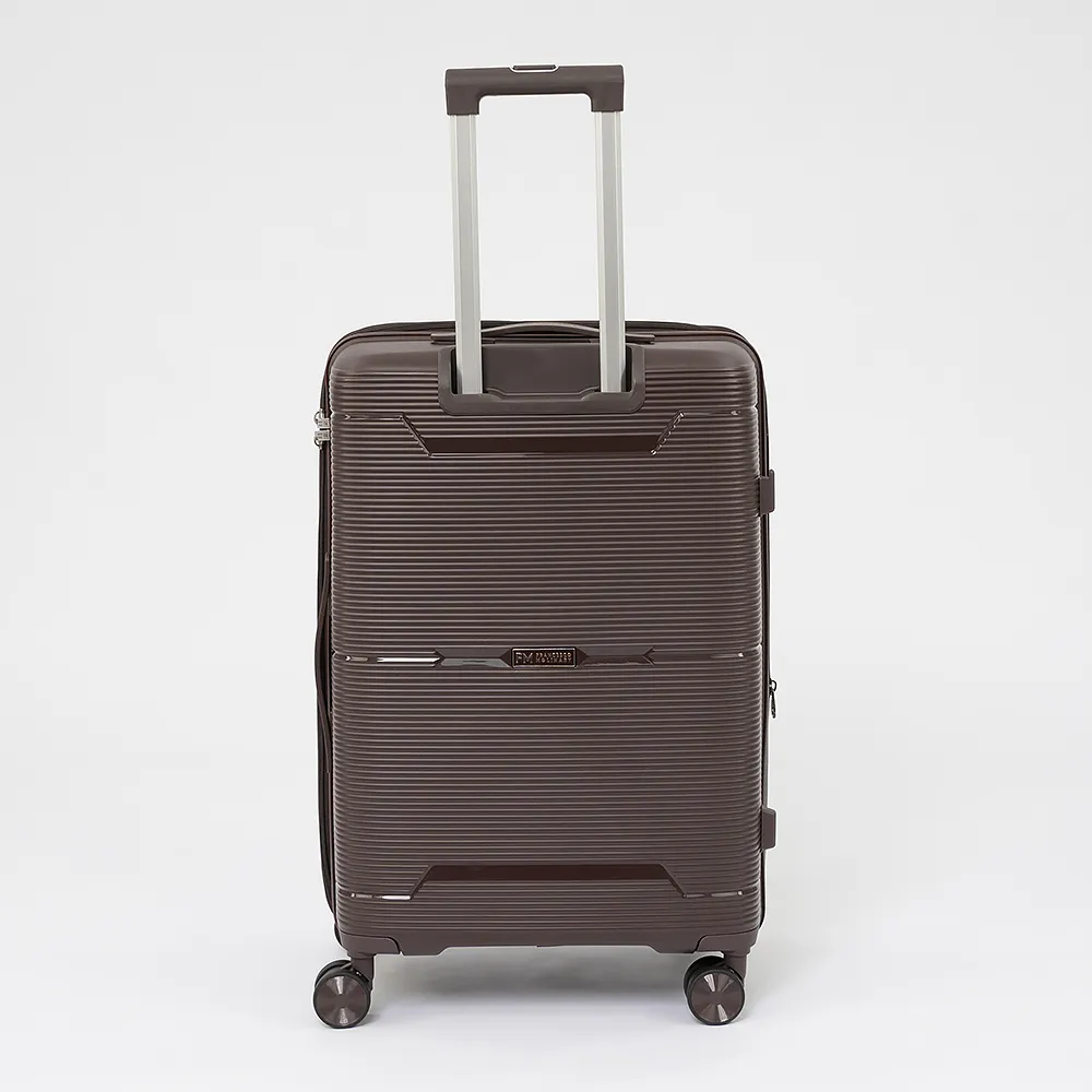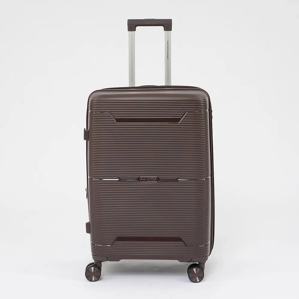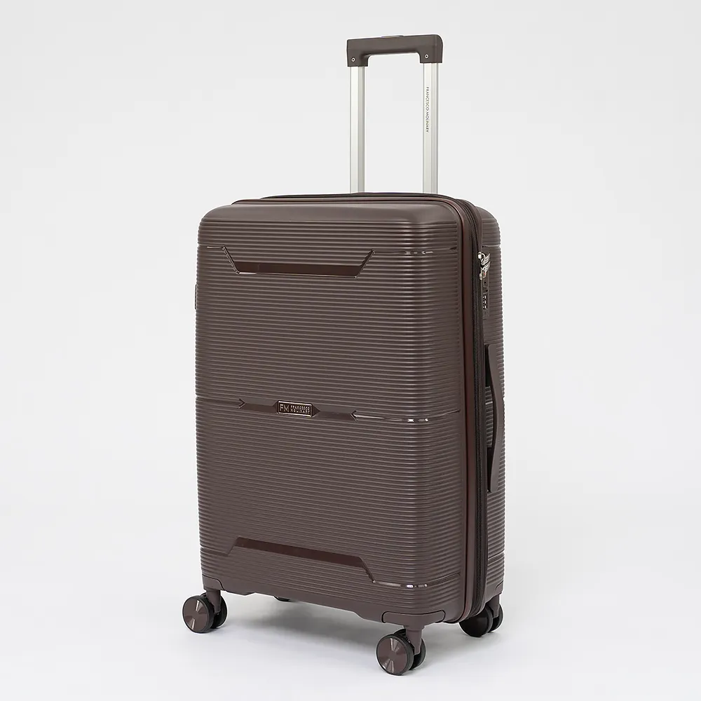 Чемодан-спиннер от торговой марки Francesco Molinary из ударопрочного полипропилена с рельефной антивандальной поверхностью цвета хаки. Модель на четырех сдвоенных колесах, с выдвижной ручкой с кнопкой и железными трубками, ручкой-переноской сверху и сбоку, ножками для защиты от износа. Закрывается молнией №8 антивор, имеется кодовый замок TSA. Внутри: фирменная подкладка, в одной части - клапан-разделитель на молнии, карман-сетка на молнии и водонепроницаемый карман, в другой части - перекрестные ремни для фиксации багажа. Сбоку предусмотрены крючки для подвешивания сумки или пакета.