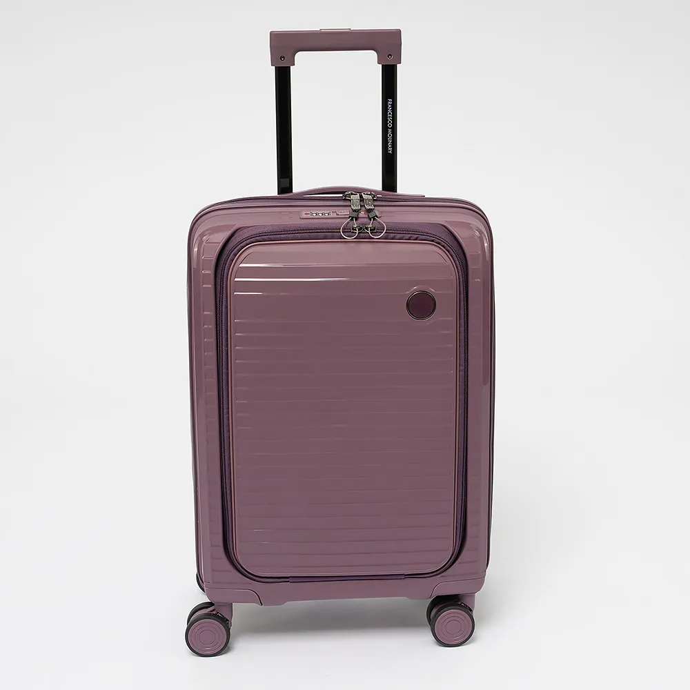 Чемодан-спиннер от торговой марки Francesco Molinary из ударопрочного термостойкого полипропилена с рельефными полосами в фиолетовом цвете. Модель на четырех сдвоенных пластиковых колесах, с выдвижной телескопической ручкой, прорезиненной ручкой сверху. Закрывается двойной антивандальной молнией антивор, имеется кодовый замок. Внутри: фирменная подкладка плотностью 210 Ден, в одной части - клапан-разделитель на молнии, в другой - перекрестные фиксирующие ремни для багажа. На лицевой стороне - функциональный карман на молнии с двумя встречными бегунками, раскрытие регулируется вытачками на липучках. Внутри: накладной карман с уплотненной стенкой для ноутбука, два накладных кармана, карман-сетка на молнии.