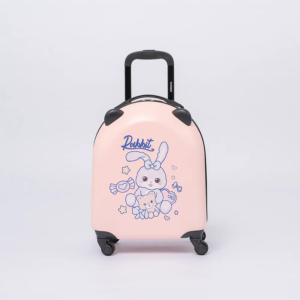 Чемодан-спиннер от торговой марки Ecotope из ударопрочного ABS пластика и поликарбоната в розовом цвете с изображением весёлого зайчика. Модель на четырех колесах, с выдвижной ручкой и ручкой-переноской сверху. Закрывается молнией. Внутри: фирменная подкладка, в одной из частей - клапан-разделитель на молнии, в другой - перекрестные ремни для фиксации багажа.