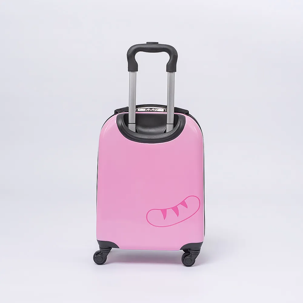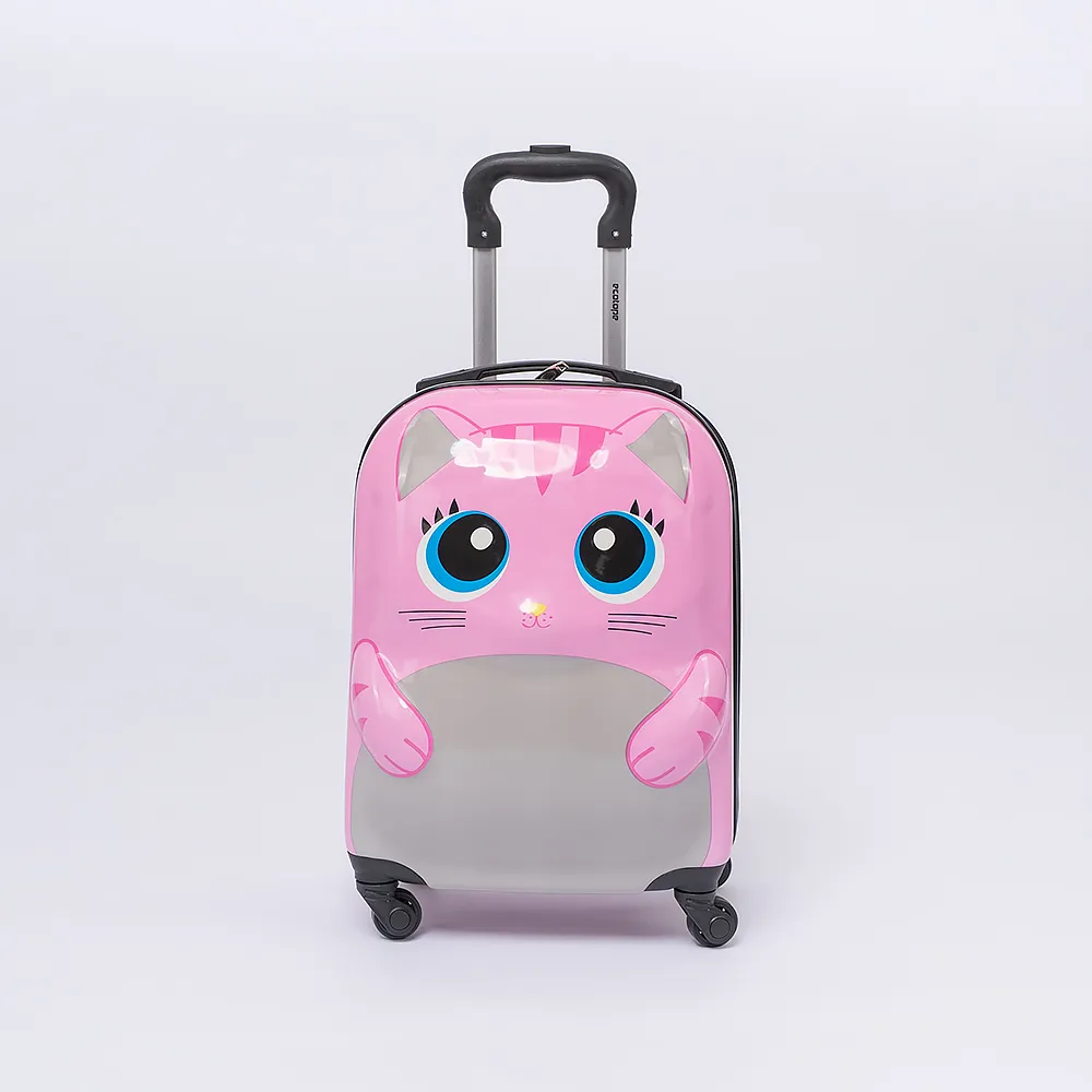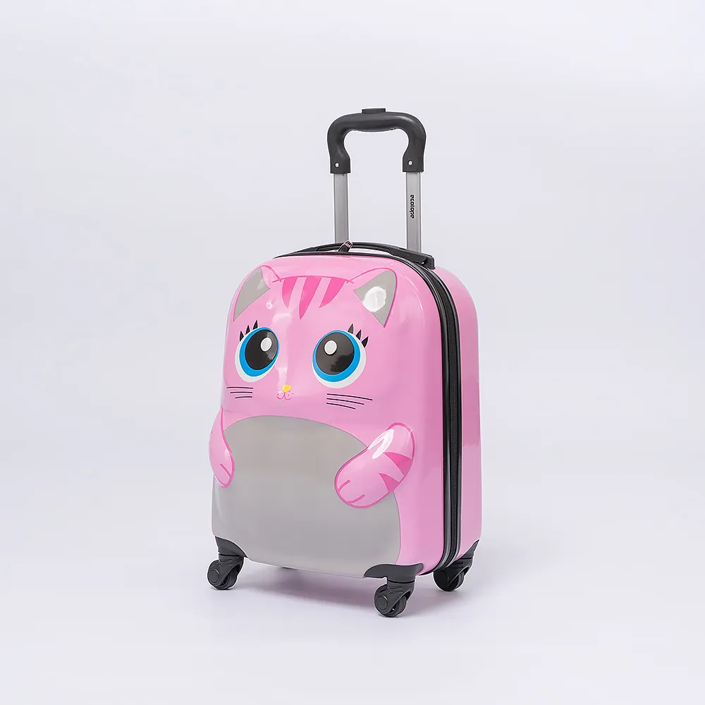 Чемодан-спиннер от торговой марки Ecotope из ударопрочного ABS пластика и поликарбоната в розовом цвете с изображением мордочки котенка. Модель на четырех колесах, с выдвижной ручкой и ручкой-переноской сверху. Закрывается молнией. Внутри: фирменная подкладка, в одной из частей - клапан-разделитель на молнии, в другой - перекрестные ремни для фиксации багажа.