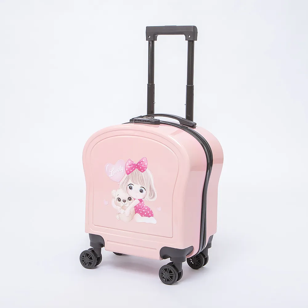 Чемодан-спиннер от торговой марки Ecotope из ударопрочного ABS пластика и поликарбоната в розовом цвете с изображением девочки и мишки. Модель на четырех колесах, с выдвижной ручкой и ручкой-переноской сверху. Закрывается молнией, имеется кодовый замок. Внутри: фирменная подкладка, в одной из частей - клапан-разделитель на молнии, в другой - перекрестные ремни для фиксации багажа.
