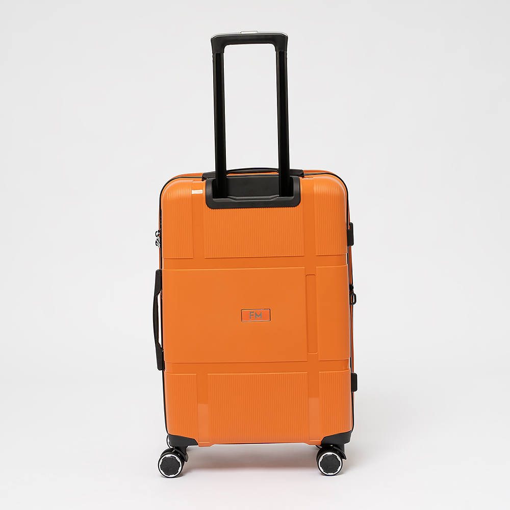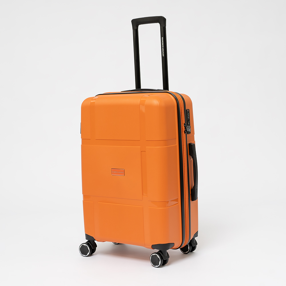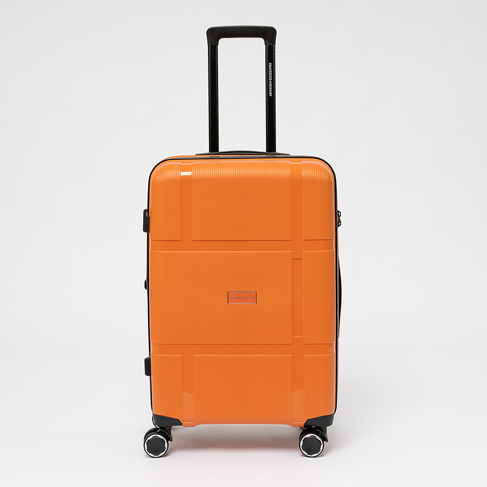 Чемодан-спиннер от торговой марки Francesco Molinary из ударопрочного термостойкого полипропилена с антивандальной узорной поверхностью разной фактуры в оранжевом цвете. Модель на четырех сдвоенных пластиковых колесах, с выдвижной ручкой с железными трубками, ручкой-переноской сверху. Закрывается двойной антивандальной молнией, имеется кодовый замок TSA, встроенный в корпус. Внутри: фирменная подкладка плотностью 210 Ден, в одной части - перекрестные ремни для фиксации багажа, в другой - клапан-разделитель на молнии. Размер подходит в качестве ручной клади для большинства авиакомпаний.