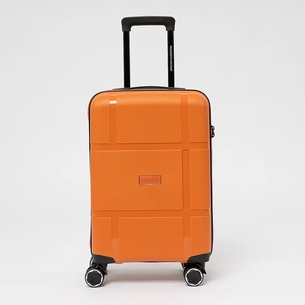Чемодан-спиннер от торговой марки Francesco Molinary из ударопрочного термостойкого полипропилена с антивандальной узорной поверхностью разной фактуры в оранжевом цвете. Модель на четырех сдвоенных пластиковых колесах, с выдвижной ручкой с железными трубками, ручкой-переноской сверху. Закрывается двойной антивандальной молнией, имеется кодовый замок TSA, встроенный в корпус. Внутри: фирменная подкладка плотностью 210 Ден, в одной части - перекрестные ремни для фиксации багажа, в другой - клапан-разделитель на молнии. Размер подходит в качестве ручной клади для большинства авиакомпаний.