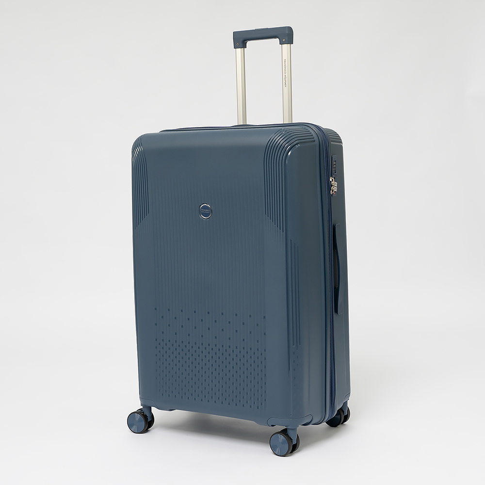 Чемодан-спиннер от торговой марки Francesco Molinary из ударопрочного термостойкого полипропилена с антивандальной узорной поверхностью в сером цвете. Модель на четырех сдвоенных пластиковых колесах, с выдвижной ручкой с железными трубками, ручкой-переноской сверху и сбоку. Закрывается двойной антивандальной молнией, установлен кодовый замок TSA, встроенный в корпус. Внутри: фирменная подкладка, в одной части - перекрестные ремни для фиксации багажа, в другой - клапан-разделитель на молнии, карман-сетка на молнии и водонепроницаемый карман. Cбоку имеются крючки для подвешивания сумки или пакета. Оснащен молнией для увеличения объема.