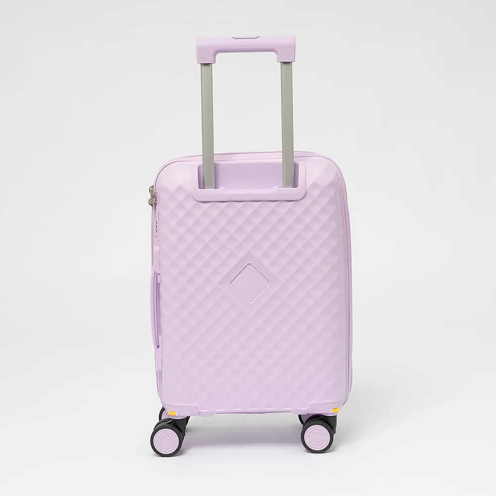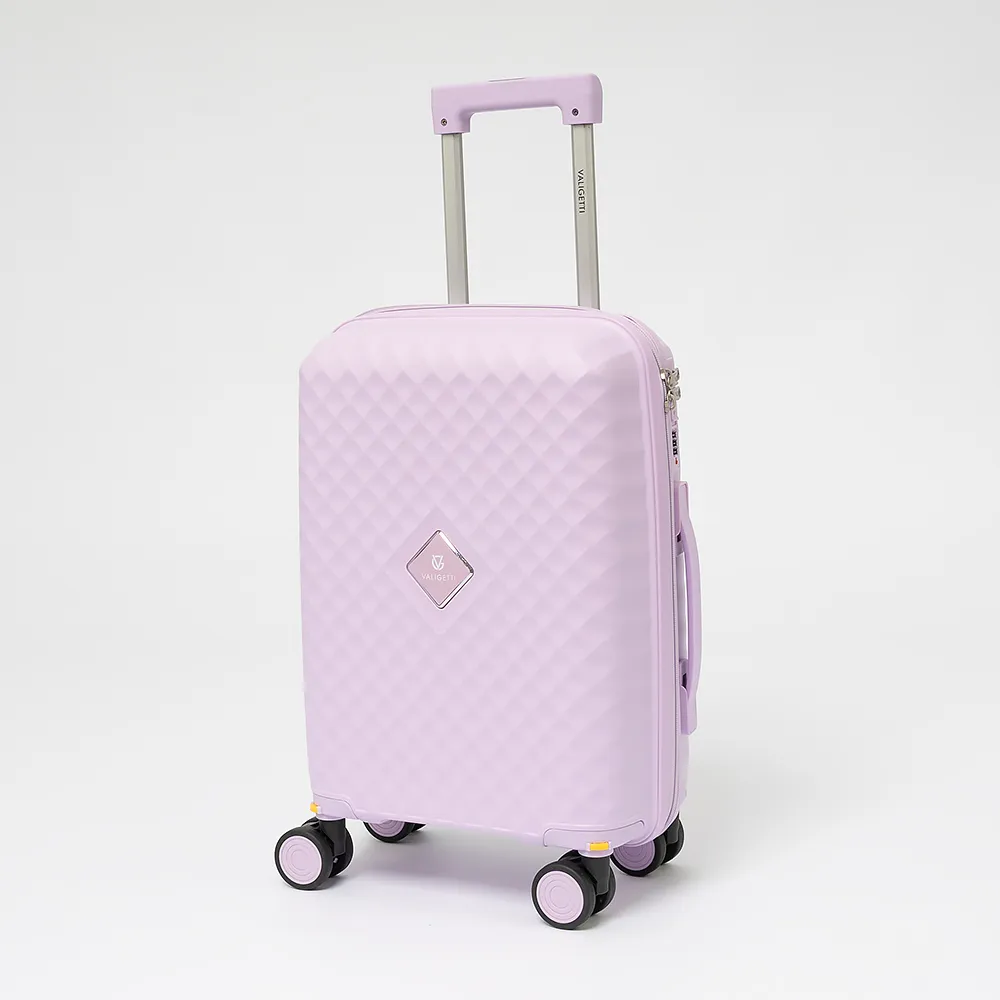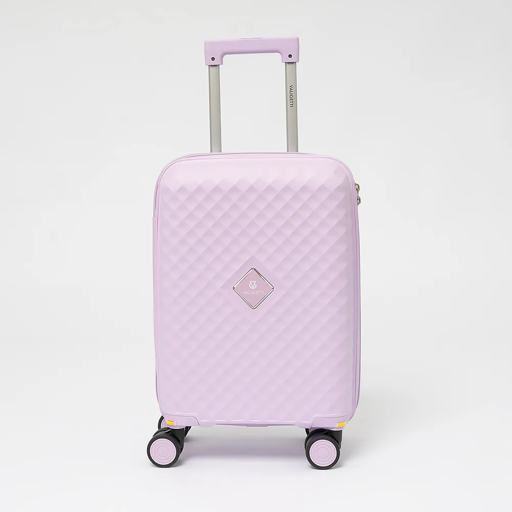 Чемодан-спиннер от торговой марки Valigetti из термостойкого ударопрочного полипропилена сиреневого цвета с узорной рельефной поверхностью. Модель на четырех сдвоенных пластиковых колесах, с выдвижной ручкой, ручками-переносками сверху и сбоку. Закрывается молнией, имеется кодовый замок, утопленный в корпус. Внутри: фирменная подкладка, в одной части - клапан-разделитель на молнии, карман-сетка, в другой части - перекрестные фиксирующие ремни для багажа. На боковых ножках предусмотрены крючки для подвешивания.
