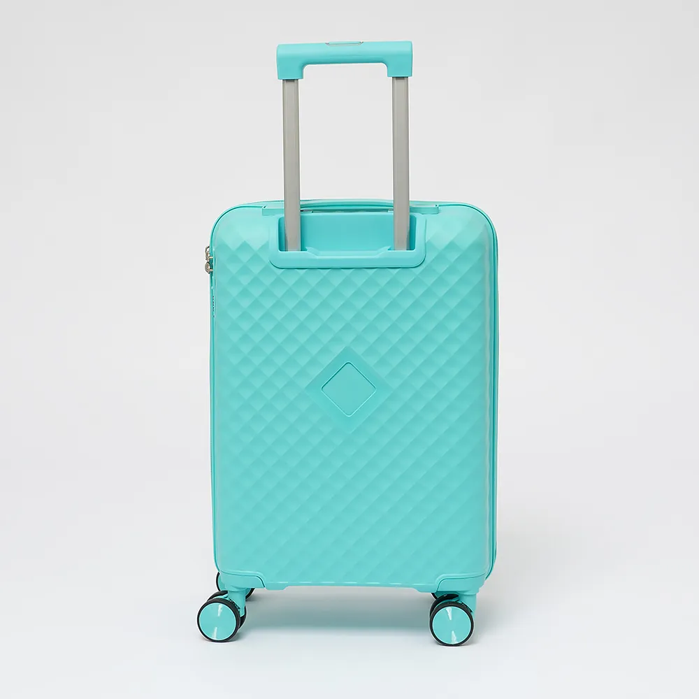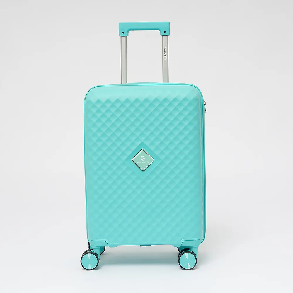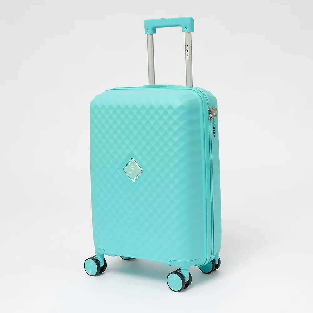 Чемодан-спиннер от торговой марки Valigetti из термостойкого ударопрочного полипропилена сиреневого цвета с узорной рельефной поверхностью. Модель на четырех сдвоенных пластиковых колесах, с выдвижной ручкой, ручками-переносками сверху и сбоку. Закрывается молнией, имеется кодовый замок, утопленный в корпус. Внутри: фирменная подкладка, в одной части - клапан-разделитель на молнии, карман-сетка, в другой части - перекрестные фиксирующие ремни для багажа. На боковых ножках предусмотрены крючки для подвешивания.