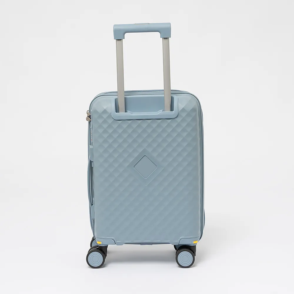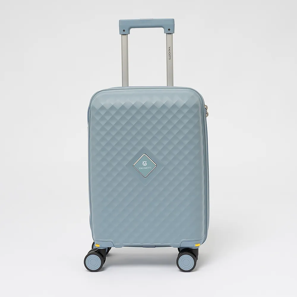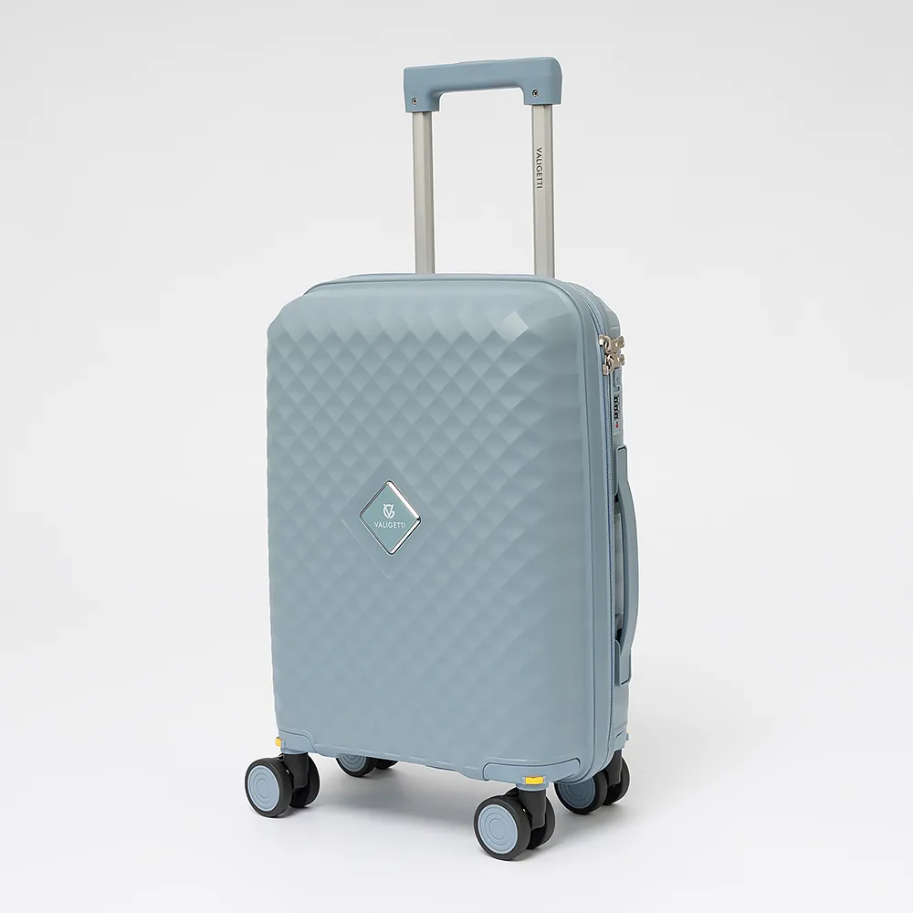 Чемодан-спиннер от торговой марки Valigetti из термостойкого ударопрочного полипропилена сиреневого цвета с узорной рельефной поверхностью. Модель на четырех сдвоенных пластиковых колесах, с выдвижной ручкой, ручками-переносками сверху и сбоку. Закрывается молнией, имеется кодовый замок, утопленный в корпус. Внутри: фирменная подкладка, в одной части - клапан-разделитель на молнии, карман-сетка, в другой части - перекрестные фиксирующие ремни для багажа. На боковых ножках предусмотрены крючки для подвешивания.