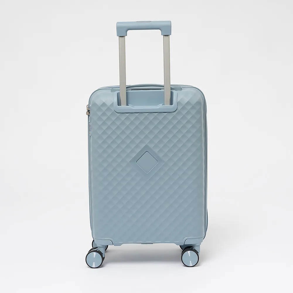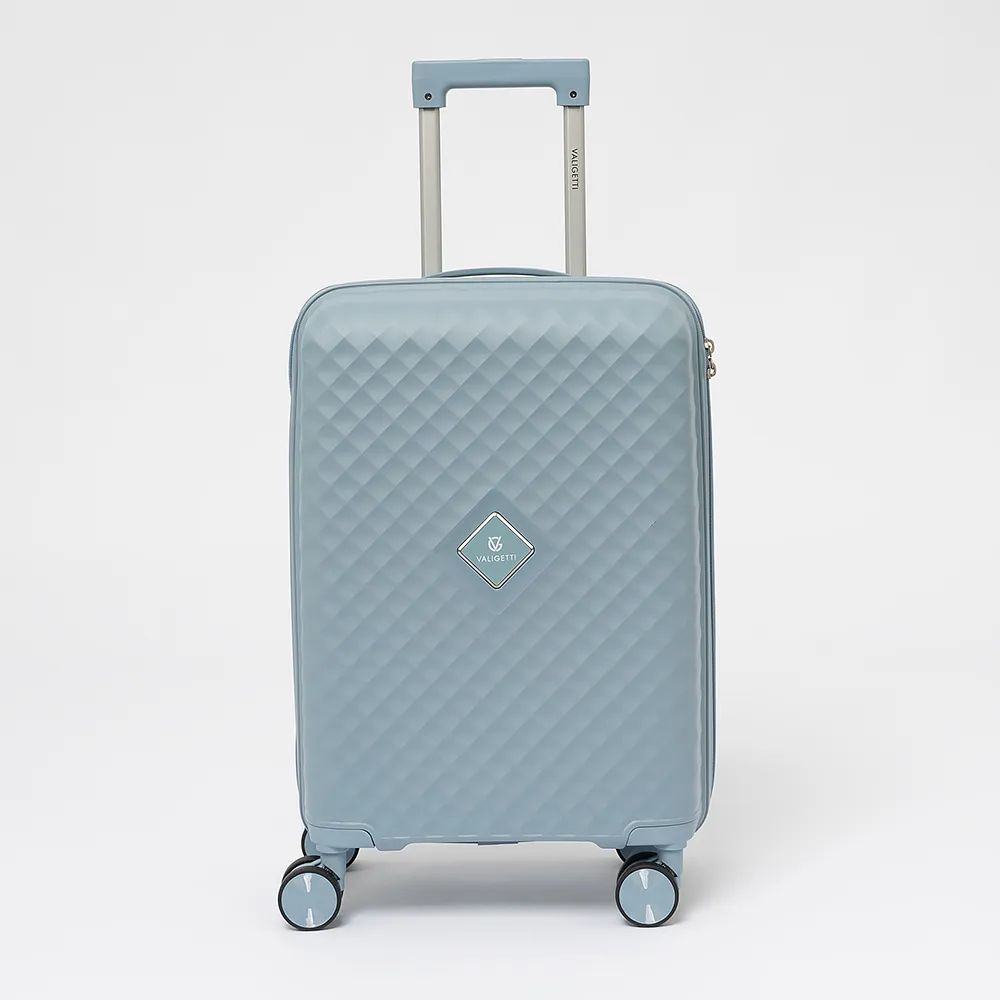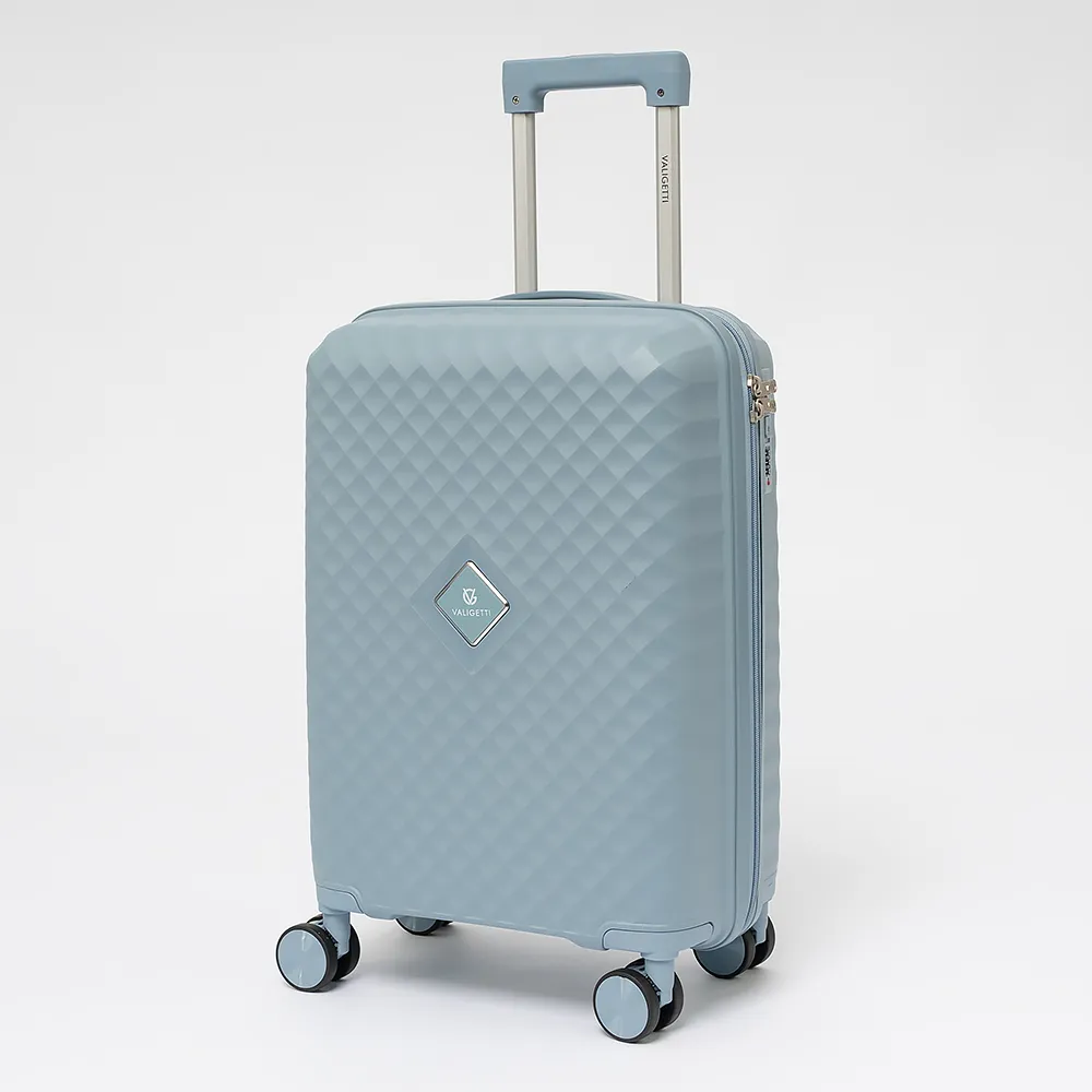 Чемодан-спиннер от торговой марки Valigetti из термостойкого ударопрочного полипропилена сиреневого цвета с узорной рельефной поверхностью. Модель на четырех сдвоенных пластиковых колесах, с выдвижной ручкой, ручками-переносками сверху и сбоку. Закрывается молнией, имеется кодовый замок, утопленный в корпус. Внутри: фирменная подкладка, в одной части - клапан-разделитель на молнии, карман-сетка, в другой части - перекрестные фиксирующие ремни для багажа. На боковых ножках предусмотрены крючки для подвешивания.