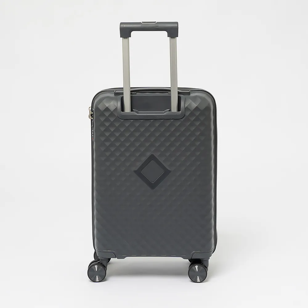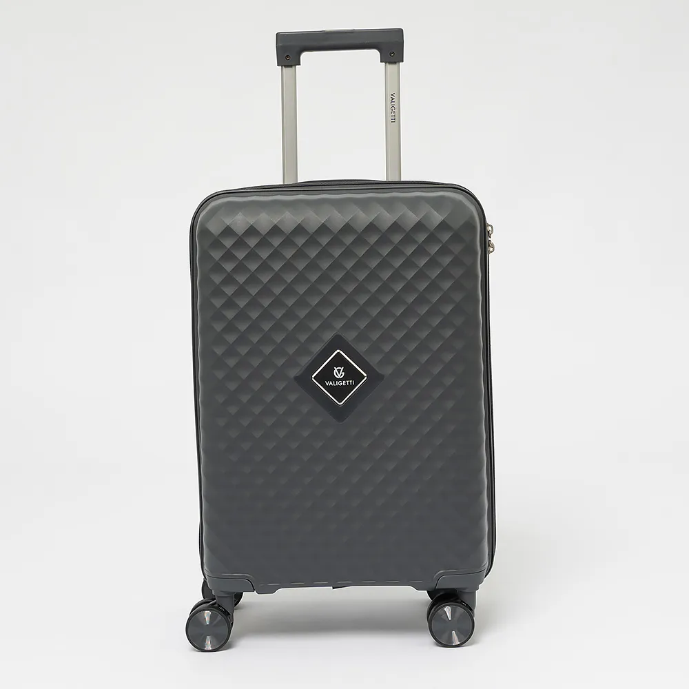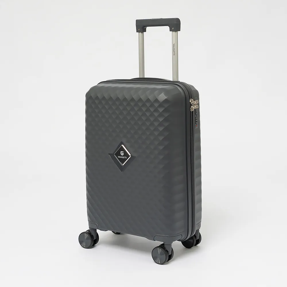 Чемодан-спиннер от торговой марки Valigetti из термостойкого ударопрочного полипропилена сиреневого цвета с узорной рельефной поверхностью. Модель на четырех сдвоенных пластиковых колесах, с выдвижной ручкой, ручками-переносками сверху и сбоку. Закрывается молнией, имеется кодовый замок, утопленный в корпус. Внутри: фирменная подкладка, в одной части - клапан-разделитель на молнии, карман-сетка, в другой части - перекрестные фиксирующие ремни для багажа. На боковых ножках предусмотрены крючки для подвешивания.