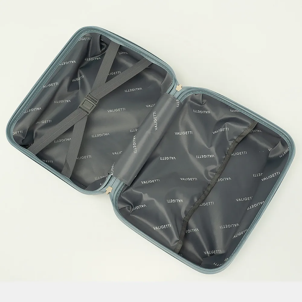 Чемодан-спиннер от торговой марки Valigetti из термостойкого ударопрочного полипропилена сиреневого цвета с узорной рельефной поверхностью. Модель на четырех сдвоенных пластиковых колесах, с выдвижной ручкой, ручками-переносками сверху и сбоку. Закрывается молнией, имеется кодовый замок, утопленный в корпус. Внутри: фирменная подкладка, в одной части - клапан-разделитель на молнии, карман-сетка, в другой части - перекрестные фиксирующие ремни для багажа. На боковых ножках предусмотрены крючки для подвешивания.