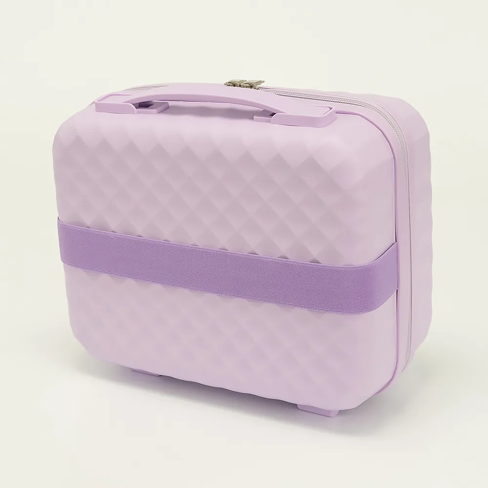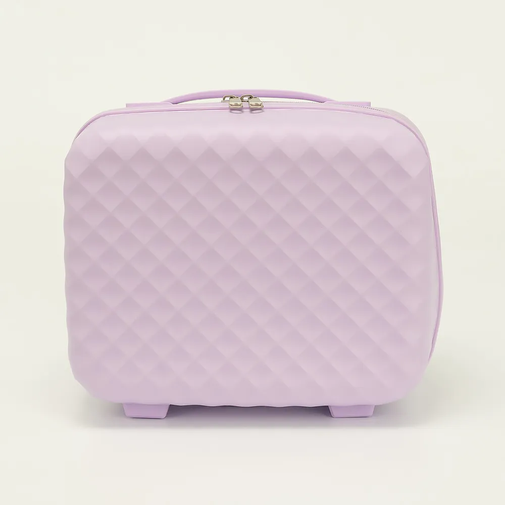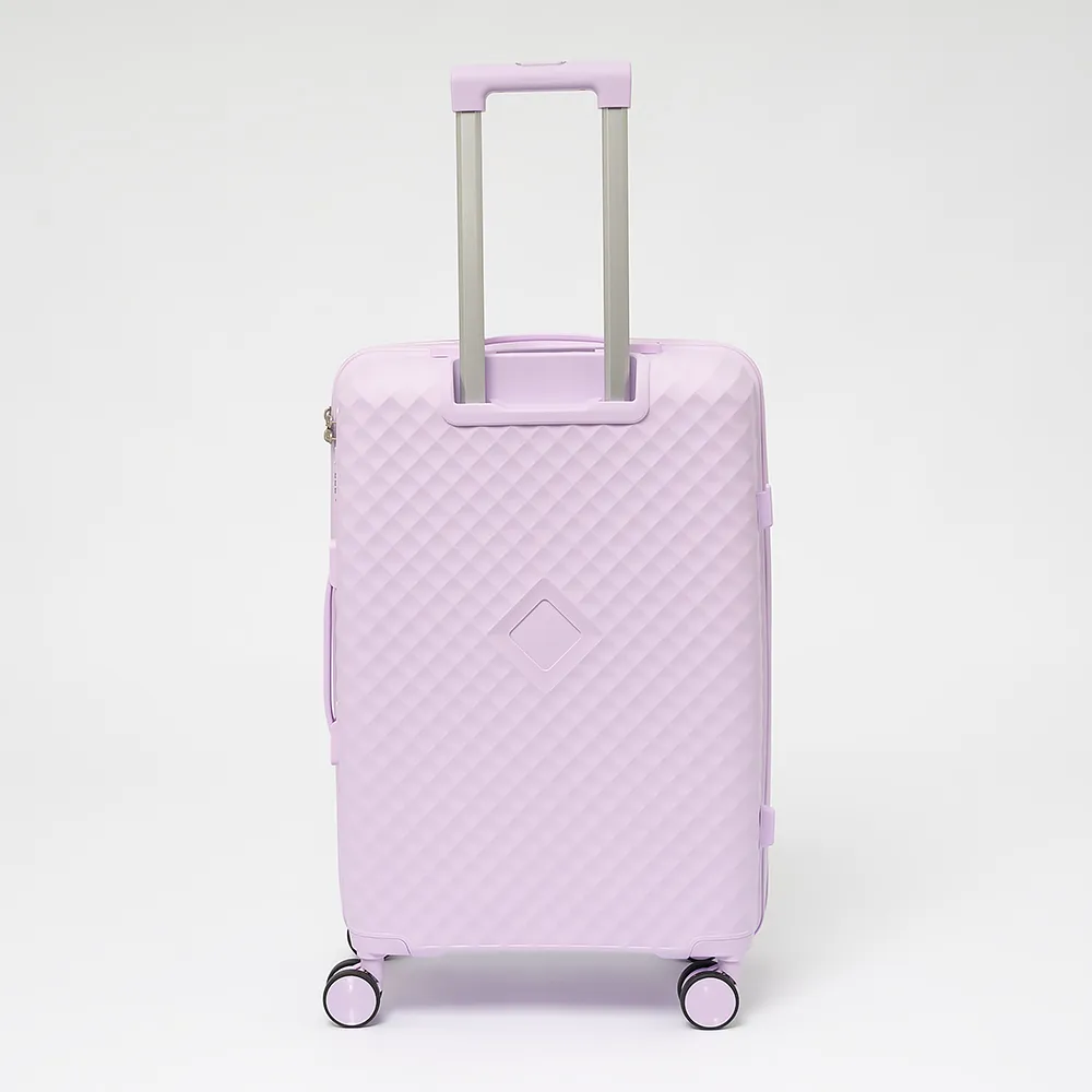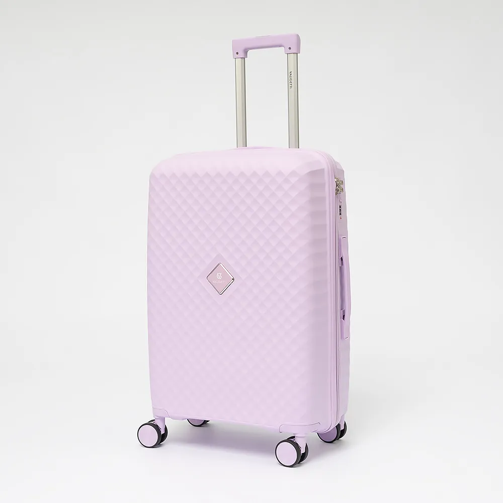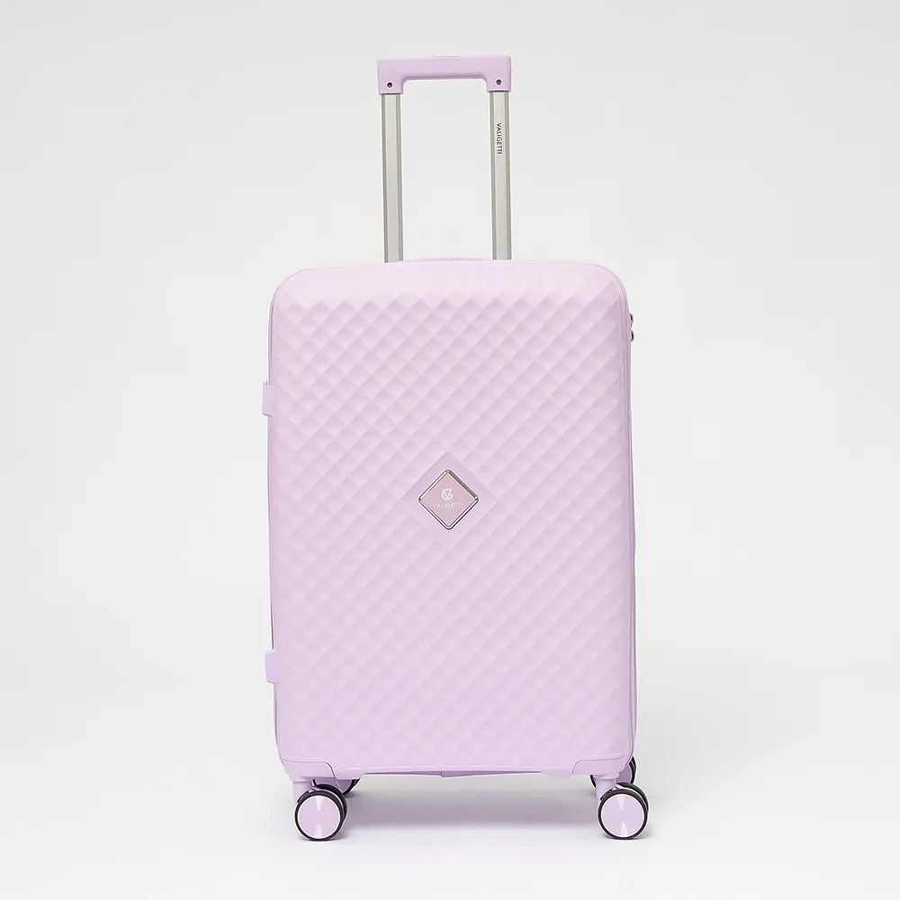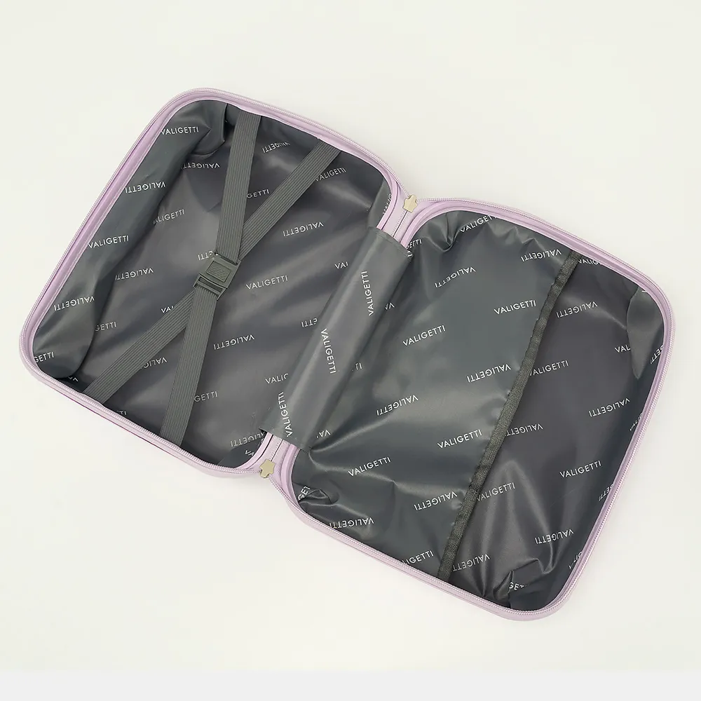 Чемодан-спиннер от торговой марки Valigetti из термостойкого ударопрочного полипропилена сиреневого цвета с узорной рельефной поверхностью. Модель на четырех сдвоенных пластиковых колесах, с выдвижной ручкой, ручками-переносками сверху и сбоку. Закрывается молнией, имеется кодовый замок, утопленный в корпус. Внутри: фирменная подкладка, в одной части - клапан-разделитель на молнии, карман-сетка, в другой части - перекрестные фиксирующие ремни для багажа. На боковых ножках предусмотрены крючки для подвешивания.