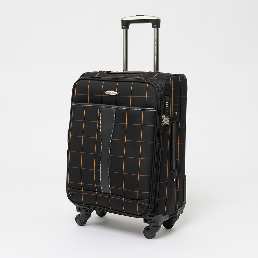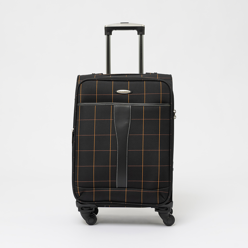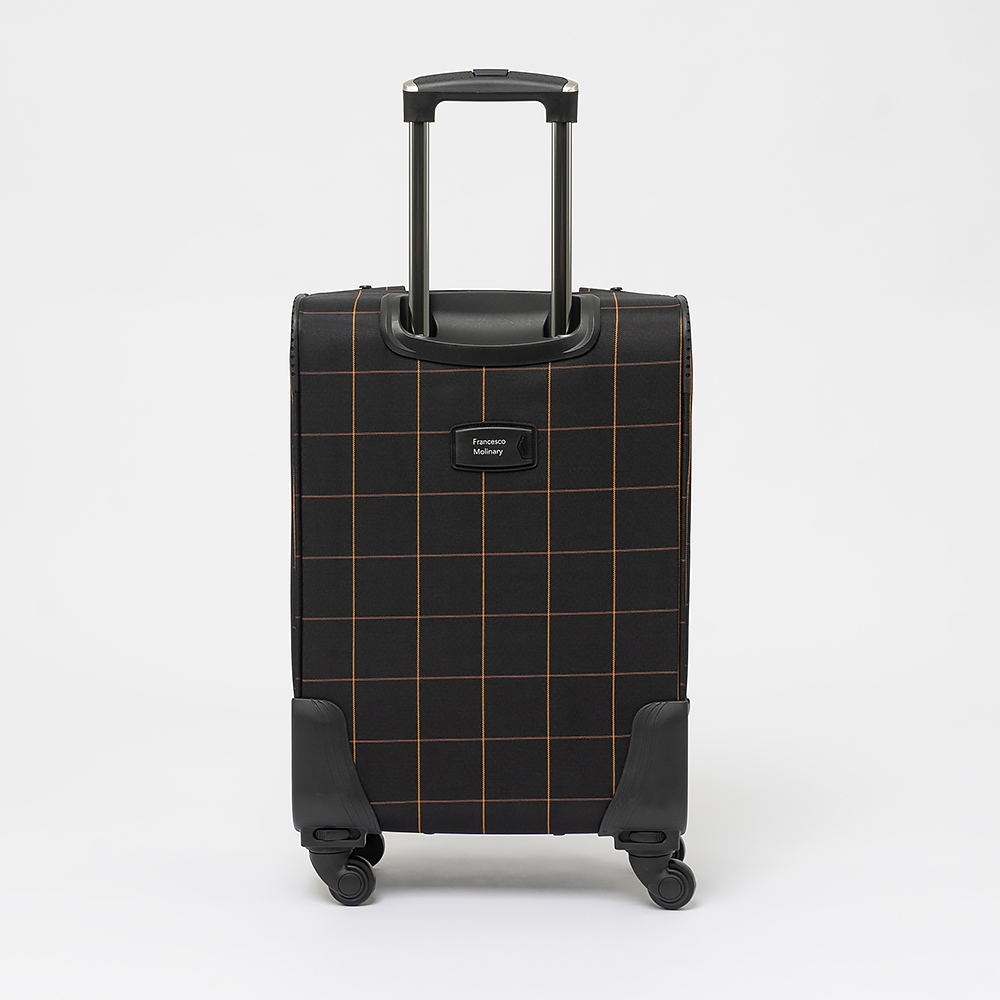 Чемодан-спиннер от бренда Francesco Molinary выполнен из плотного текстильного материала черного цвета в клетку. Декорирован вставками из искусственной кожи с контрастной отстрочкой. Модель на четырех съемных пластиковых колесах, с выдвижной металлической ручкой, ручками сверху и сбоку, пластиковыми ножками-опорами сбоку. Закрывается двойной антивандальной молнией, имеется кодовый замок TSA. Внутри: фирменная подкладка, на крышке - карман-сетка на молнии, в глубоком отделении - фиксирующие ремни для багажа. Имеется раздвижка на молнии для увеличения объема. На лицевой стороне - карман на молнии, на задней - адресная бирка.